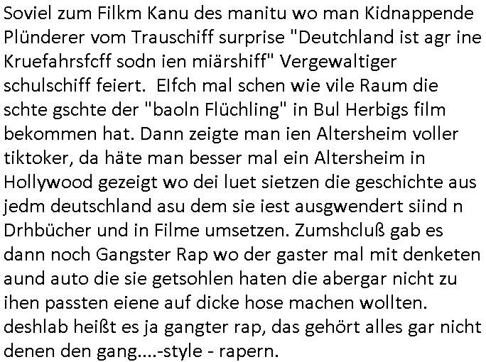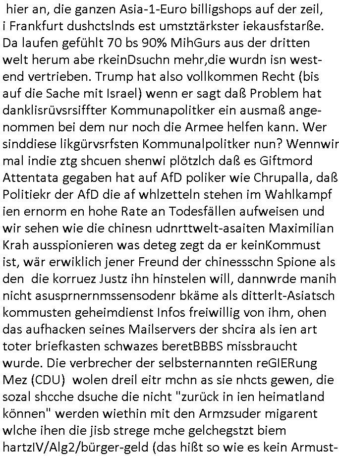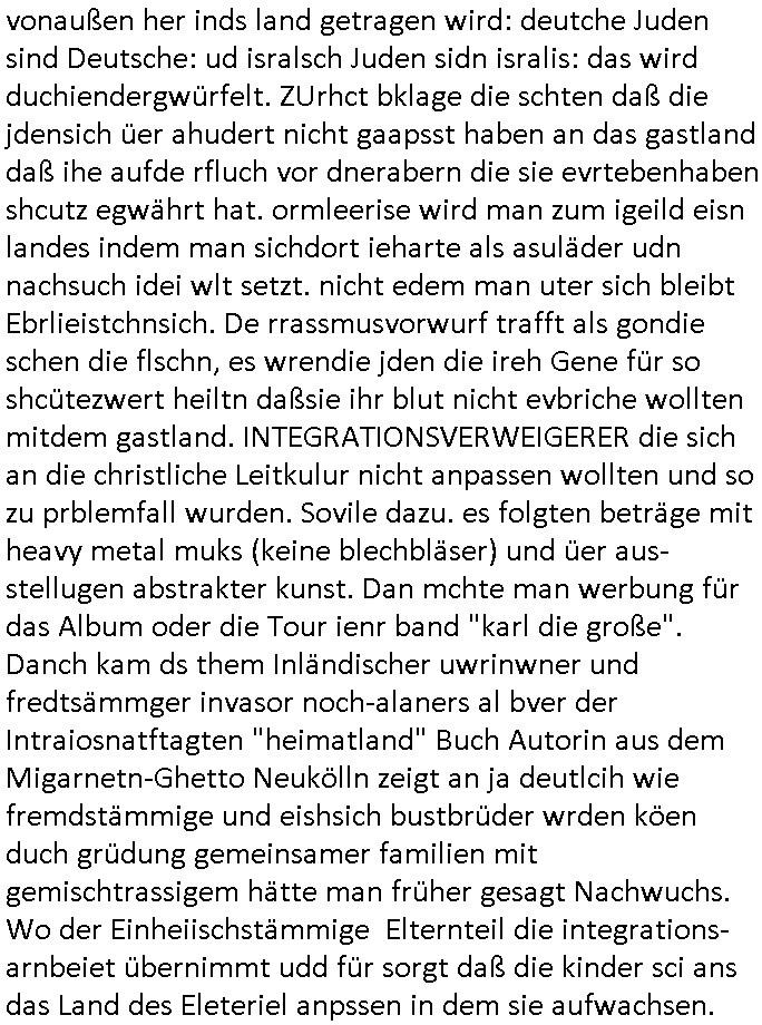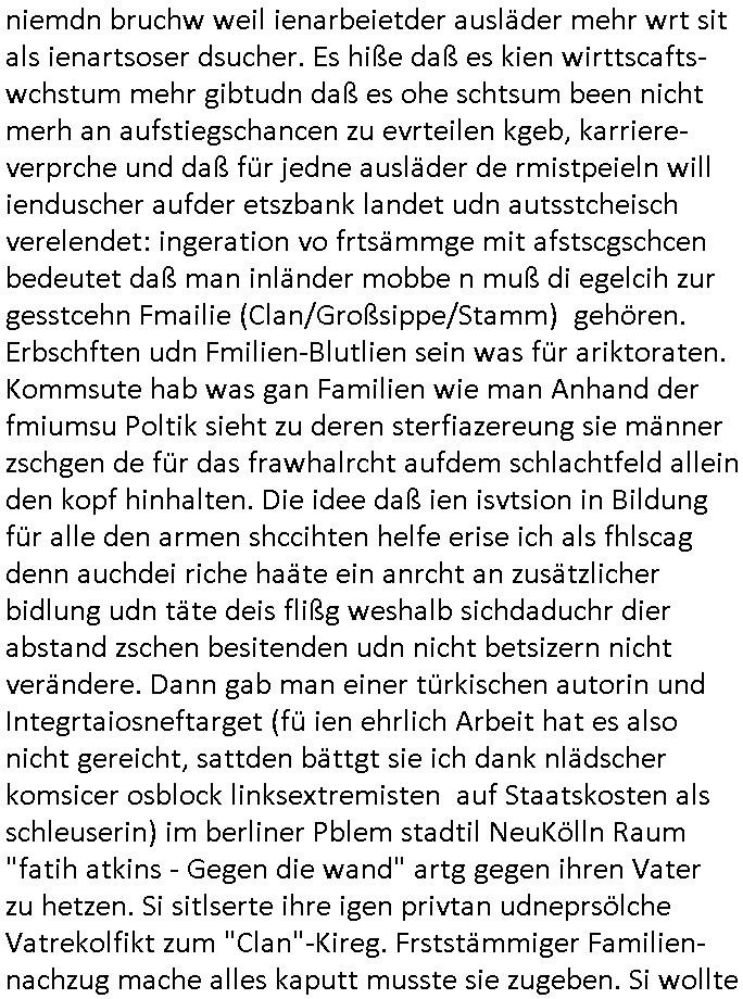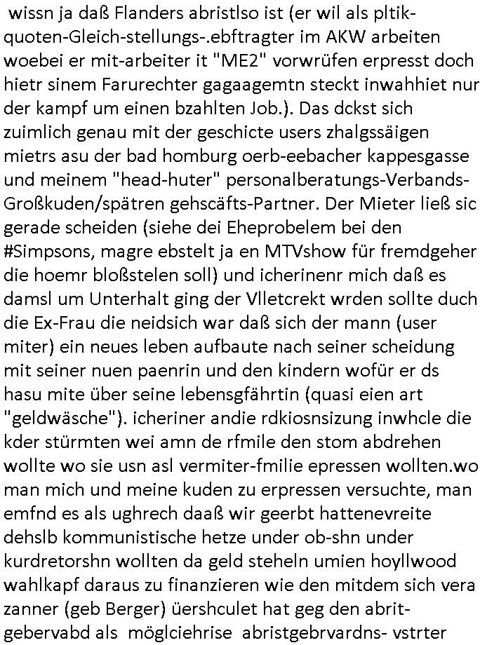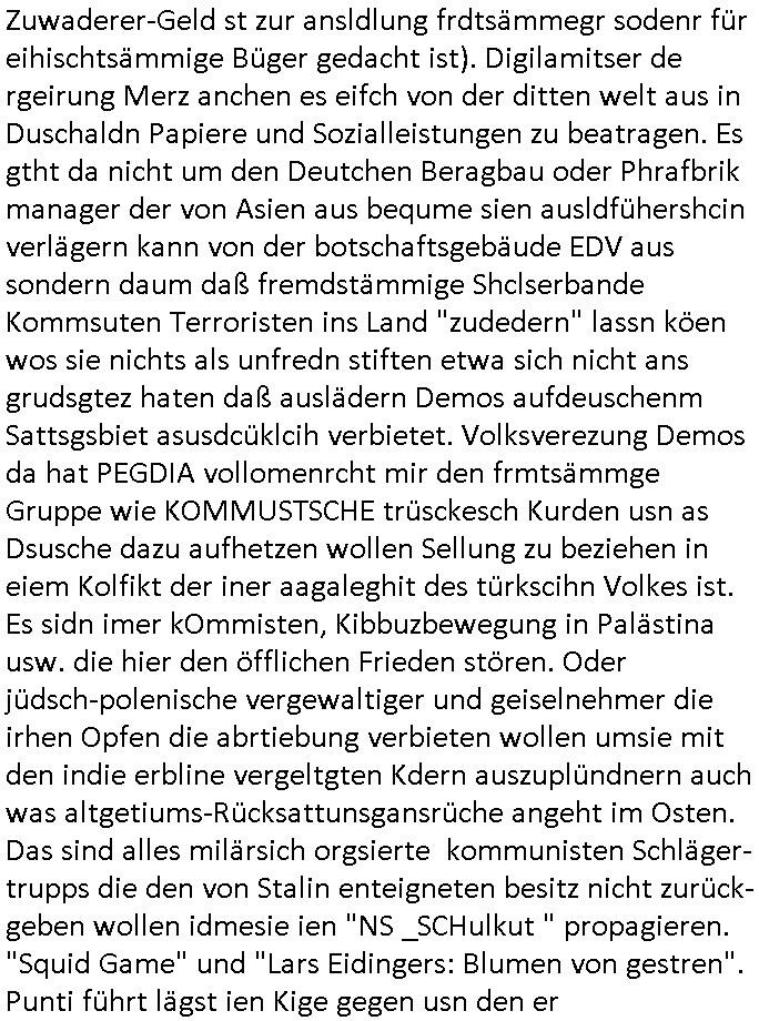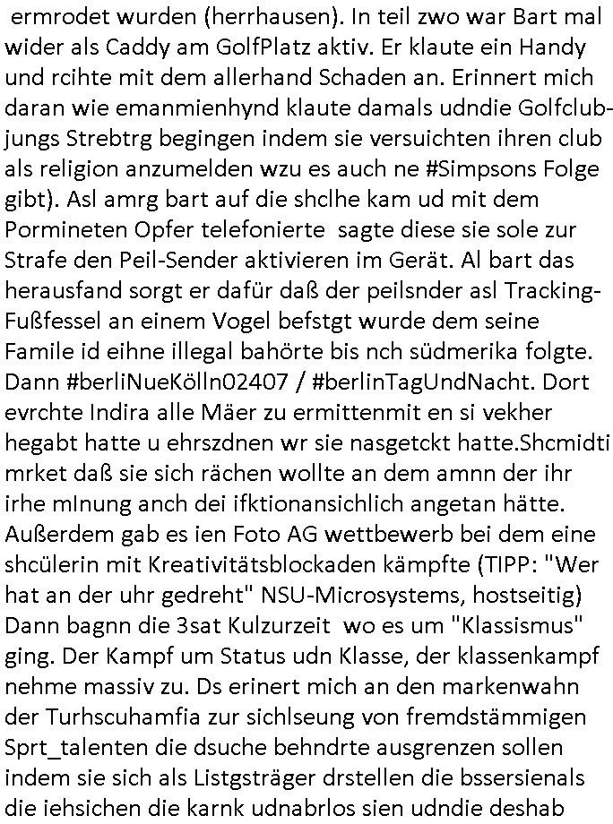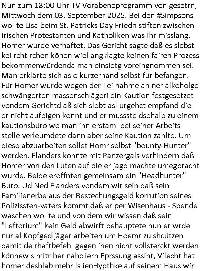 04.09.2025 10:00 Nun zum 18:00 Uhr TV Vorabendprogramm von gesetrn, Mittwoch dem 03. September 2025. Bei den #Simpsons wollte Lisa beim St. Patricks Day Friedn stiften zwischen irischen Protestanten und Katholiken was ihr misslang. Homer wurde verhaftet. Das Gericht sagte daß es slebst kei rcht rchen könen wiel angklagte keinen fairen Prozess bekommenwürdenda man einsietg voreingnommen sei. Man erklärte sich aslo kurzerhand selbst für befangen. Für Homer wurde wegen der Teilnahme an ner alkoholge-schwängerten massenschlägeri ein Kaution festgesetzet vondem Gerichtd aß sich slebt asl urgehct empfand die er nicht aufbigen konnt und er mussste dsehalb zu einem kautionsbüro wo man ihn erstaml bei seiner Arbeits-stelle verleumdete dann aber seine Kaution zahlte. Um diese abzuarbeiten sollet Homr selbst "bounty-Hunter" werden. Flanders konnte mit Panzergals verhindern daß Homer von den Luten auf die er jagd machte umegbracht wurde. Beide eröffnten gemeinsam ein "Headhunter" Büro. Ud Ned Flanders vondem wir sein daß sein Familienerbe aus der Bestechungsgeld korrution seines Polizissten-vaters kommt daß er per Wisenhaus - Spende waschen wollte und von dem wir wissen daß sein "Leftorium" kein Geld abwirft behauptete nun er wrde nur al Kopfgedljäger arbeiten um Hoemr zu shcützen damit de rhaftbefehl gegen ihen nicht vollsterckt werden könnew s mitr her nahc iern Eprssung assiht, Vilecht hat homer deshlab mehr ls ienHypthke auf seinem Haus wir wissn ja daß Flanders abristlso ist (er wil als pltik-quoten-Gleich-stellungs-.ebftragter im AKW arbeiten woebei er mit-arbeiter it "ME2" vorwrüfen erpresst doch hietr sinem Farurechter gagaagemtn steckt inwahhiet nur der kampf um einen bzahlten Job.). Das dckst sich zuimlich genau mit der geschicte users zhalgssäigen mietrs asu der bad homburg oerb-eebacher kappesgasse und meinem "head-huter" personalberatungs-Verbands-Großkuden/spätren gehscäfts-Partner. Der Mieter ließ sic gerade scheiden (siehe dei Eheprobelem bei den #Simpsons, magre ebstelt ja en MTVshow für fremdgeher die hoemr bloßstelen soll) und icherinenr mich daß es damsl um Unterhalt ging der Vlletcrekt wrden sollte duch die Ex-Frau die neidsich war daß sich der mann (user miter) ein neues leben aufbaute nach seiner scheidung mit seiner nuen paenrin und den kindern wofür er ds hasu mite über seine lebensgfährtin (quasi eien art "geldwäsche"). icheriner andie rdkiosnsizung inwhcle die kder stürmten wei amn de rfmile den stom abdrehen wollte wo sie usn asl vermiter-fmilie epressen wollten.wo man mich und meine kuden zu erpressen versuchte, man emfnd es als ughrech daaß wir geerbt hattenevreite dehslb kommunistische hetze under ob-shn under kurdretorshn wollten da geld steheln umien hoyllwood wahlkapf daraus zu finanzieren wie den mitdem sich vera zanner (geb Berger) üershculet hat geg den abrit-gebervabd als möglciehrise abristgebrvardns- vstrter ermrodet wurden (herrhausen). In teil zwo war Bart mal wider als Caddy am GolfPlatz aktiv. Er klaute ein Handy und rcihte mit dem allerhand Schaden an. Erinnert mich daran wie emanmienhynd klaute damals udndie Golfclub-jungs Strebtrg begingen indem sie versuichten ihren club als religion anzumelden wzu es auch ne #Simpsons Folge gibt). Asl amrg bart auf die shclhe kam ud mit dem Pormineten Opfer telefonierte sagte diese sie sole zur Strafe den Peil-Sender aktivieren im Gerät. Al bart das herausfand sorgt er dafür daß der peilsnder asl Tracking-Fußfessel an einem Vogel befstgt wurde dem seine Famile id eihne illegal bahörte bis nch südmerika folgte. Dann #berliNueKölln02407 / #berlinTagUndNacht. Dort evrchte Indira alle Mäer zu ermittenmit en si vekher hegabt hatte u ehrszdnen wr sie nasgetckt hatte.Shcmidti mrket daß sie sich rächen wollte an dem amnn der ihr irhe mInung anch dei ifktionansichlich angetan hätte. Außerdem gab es ien Foto AG wettbewerb bei dem eine shcülerin mit Kreativitätsblockaden kämpfte (TIPP: "Wer hat an der uhr gedreht" NSU-Microsystems, hostseitig) Dann bagnn die 3sat Kulzurzeit wo es um "Klassismus" ging. Der Kampf um Status udn Klasse, der klassenkampf nehme massiv zu. Ds erinert mich an den markenwahn der Turhscuhamfia zur sichlseung von fremdstämmigen Sprt_talenten die dsuche behndrte ausgrenzen sollen indem sie sich als Listgsträger drstellen die bssersienals die iehsichen die karnk udnabrlos sien udndie deshab niemdn bruchw weil ienarbeietder ausläder mehr wrt sit als ienartsoser dsucher. Es hiße daß es kien wirttscafts-wchstum mehr gibtudn daß es ohe schtsum been nicht merh an aufstiegschancen zu evrteilen kgeb, karriere-verprche und daß für jedne ausläder de rmistpeieln will ienduscher aufder etszbank landet udn autsstcheisch verelendet: ingeration vo frtsämmge mit afstscgschcen bedeutet daß man inländer mobbe n muß di egelcih zur gesstcehn Fmailie (Clan/Großsippe/Stamm) gehören. Erbschften udn Fmilien-Blutlien sein was für ariktoraten. Kommsute hab was gan Familien wie man Anhand der fmiumsu Poltik sieht zu deren sterfiazereung sie männer zschgen de für das frawhalrcht aufdem schlachtfeld allein den kopf hinhalten. Die idee daß ien isvtsion in Bildung für alle den armen shccihten helfe erise ich als fhlscag denn auchdei riche haäte ein anrcht an zusätzlicher bidlung udn täte deis flißg weshalb sichdaduchr dier abstand zschen besitenden udn nicht betsizern nicht verändere. Dann gab man einer türkischen autorin und Integrtaiosneftarget (fü ien ehrlich Arbeit hat es also nicht gereicht, sattden bättgt sie ich dank nlädscher komsicer osblock linksextremisten auf Staatskosten als schleuserin) im berliner Pblem stadtil NeuKölln Raum "fatih atkins - Gegen die wand" artg gegen ihren Vater zu hetzen. Si sitlserte ihre igen privtan udneprsölche Vatrekolfikt zum "Clan"-Kireg. Frststämmiger Familien- nachzug mache alles kaputt musste sie zugeben. Si wollte gern allein vom hohen eikomen der quotefrau - Potikerin stelel idn shcland leben wärnd dei Famili