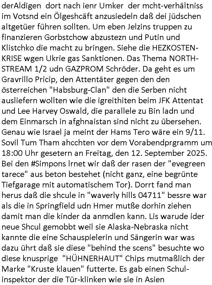derAldigen dort nach ienr Umker der mcht-verhältniss im Votsnd ein Ölgeshcäft anzusiedeln daß dei jüdschen altgetüer führen sollten. Um eben Jelzins truppen zu finanzieren Gorbstchow abzustezn und Putin und Klistchko die macht zu bringen. Siehe die HEZKOSTEN-KRISE wgen Ukrie gas Sanktionen. Das Thema NORTH-STREAM 1/2 udn GAZPROM Schröder. Da geht es um Gravrillo Pricip, den Attentäter gegen den den österreichen "Habsburg-Clan" den die Serben nicht ausliefern wollten wie die igreithiten beim JFK Attentat und Lee Harvey Oswald, die parallele zu Bin ladn und dem Einmarsch in afghnaistan sind nicht zu übersehen. Genau wie Israel ja meint der Hams Tero wäre ein 9/11. Sovil Tum Tham ahcchten vor dem Vorabendprgramm um 18:00 Uhr gesetern an Freitag, den 12. September 2025. Bei den #Simpons lrnet wir daß der rasen der "evegreen tarece" aus beton bestehet (nicht ganz, eine begrünte Tiefgarage mit automatischem Tor). Dorrt fand man herus daß die shcule in "waverly hills 04711" bessre war als die in Springfield udn Hmer mutße dorhin ziehen damit man die kinder da anmdlen kann. Lis warude ider neue Shcul gemobbt weil sie Alaska-Nebraska nicht kannte die eine Schauspielerin und Sängerin war was dazu ührt daß sie diese "behind the scens" besuchte wo diese knusprige "HÜHNERHAUT" Chips mutmaßlich der Marke "Kruste klauen" futterte. Es gab einen Schul-inspektor der die Tür-klinken wie sie in Asien