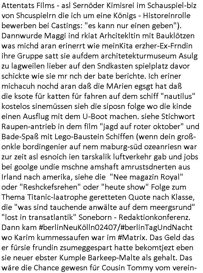 Attentats Films - asl Sernöder Kimisrei im Schauspiel-biz von Shcuspielrn die ich um eine Königs - Historeinrolle bewerben bei Castings: "es kann nur einen geben"). Dannwurde Maggi ind rkiat Arhcitekltin mit Bauklötzen was michd aran erinerrt wie meinKita erzher-Ex-Frndin ihre Gruppe satt sie aufdem architetekturmuseum Asulg zu lagweilen lieber auf den Sndkasten spielplatz davor schickte wie sie mr nch der bate berichte. Ich eriner michacuh nochd aran daß die MArien egsgt hat daß die ksote für katten für fahren auf dem schiff "nautilus" kostelos sinemüssen sieh die siposn folge wo die kinde einen Ausflug mit dem U-Boot machen. siehe Stichwort Raupen-antrieb in dem film "jagd auf roter oktober" und Bade-Spaß mit Lego-Baustein Schiffen (wenn dein groß-onkle bordingenier auf nem maburg-süd ozeanriesn war zur zeit asl esnoich ien tarskalik luftverkehr gab und jobs bei goolge undie mschne amshaft amrustsdnerten aus Irland nach amerika, siehe die "Nee magazin Royal" oder "Reshckefsrehen" oder "heute show" Folge zum Thema Titanic-laatrophe geretteten Quote nach Klasse, die "was sind tauchende anwälte auf dem meergsrund" "lost in transatlantik" Soneborn - Redaktionkonferenz. Dann kam #berlinNeuKölln02407/#berlinTagUndNacht wo Karim kummessaufen war im #Matrix. Das Geld das er fürsie frundin zsumeggespart hatte bekomtjezt eben sie neuer ebster Kumple Barkeep-Malte als gehalt. Das wäre die Chance gewesn für Cousin Tommy vom verein-