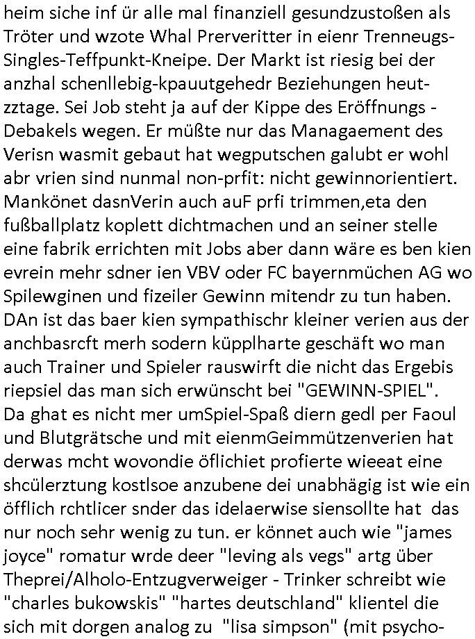 heim siche inf ür alle mal finanziell gesundzustoßen als Tröter und wzote Whal Prerveritter in eienr Trenneugs- Singles-Teffpunkt-Kneipe. Der Markt ist riesig bei der anzhal schenllebig-kpauutgehedr Beziehungen heut-zztage. Sei Job steht ja auf der Kippe des Eröffnungs - Debakels wegen. Er müßte nur das Managaement des Verisn wasmit gebaut hat wegputschen galubt er wohl abr vrien sind nunmal non-prfit: nicht gewinnorientiert. Mankönet dasnVerin auch auF prfi trimmen,eta den fußballplatz koplett dichtmachen und an seiner stelle eine fabrik errichten mit Jobs aber dann wäre es ben kien evrein mehr sdner ien VBV oder FC bayernmüchen AG wo Spilewginen und fizeiler Gewinn mitendr zu tun haben. DAn ist das baer kien sympathischr kleiner verien aus der anchbasrcft merh sodern küpplharte geschäft wo man auch Trainer und Spieler rauswirft die nicht das Ergebis riepsiel das man sich erwünscht bei "GEWINN-SPIEL". Da ghat es nicht mer umSpiel-Spaß diern gedl per Faoul und Blutgrätsche und mit eienmGeimmützenverien hat derwas mcht wovondie öflichiet profierte wieeat eine shcülerztung kostlsoe anzubene dei unabhägig ist wie ein öfflich rchtlicer snder das idelaerwise siensollte hat das nur noch sehr wenig zu tun. er könnet auch wie "james joyce" romatur wrde deer "leving als vegs" artg über Theprei/Alholo-Entzugverweiger - Trinker schreibt wie "charles bukowskis" "hartes deutschland" klientel die sich mit dorgen analog zu "lisa simpson" (mit psycho-