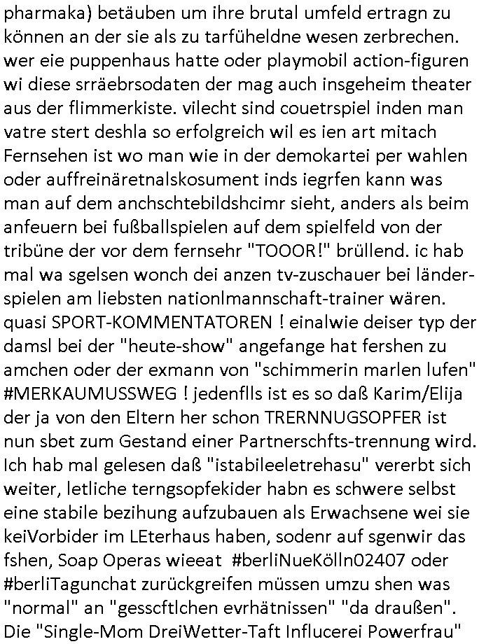 pharmaka) betäuben um ihre brutal umfeld ertragn zu können an der sie als zu tarfüheldne wesen zerbrechen. wer eie puppenhaus hatte oder playmobil action-figuren wi diese srräebrsodaten der mag auch insgeheim theater aus der flimmerkiste. vilecht sind couetrspiel inden man vatre stert deshla so erfolgreich wil es ien art mitach Fernsehen ist wo man wie in der demokartei per wahlen oder auffreinäretnalskosument inds iegrfen kann was man auf dem anchschtebildshcimr sieht, anders als beim anfeuern bei fußballspielen auf dem spielfeld von der tribüne der vor dem fernsehr "TOOOR!" brüllend. ic hab mal wa sgelsen wonch dei anzen tv-zuschauer bei länder-spielen am liebsten nationlmannschaft-trainer wären. quasi SPORT-KOMMENTATOREN ! einalwie deiser typ der damsl bei der "heute-show" angefange hat fershen zu amchen oder der exmann von "schimmerin marlen lufen" #MERKAUMUSSWEG ! jedenflls ist es so daß Karim/Elija der ja von den Eltern her schon TRERNNUGSOPFER ist nun sbet zum Gestand einer Partnerschfts-trennung wird. Ich hab mal gelesen daß "istabileeletrehasu" vererbt sich weiter, letliche terngsopfekider habn es schwere selbst eine stabile bezihung aufzubauen als Erwachsene wei sie keiVorbider im LEterhaus haben, sodenr auf sgenwir das fshen, Soap Operas wieeat #berliNueKölln02407 oder #berliTagunchat zurückgreifen müssen umzu shen was "normal" an "gesscftlchen evrhätnissen" "da draußen". Die "Single-Mom DreiWetter-Taft Influcerei Powerfrau"