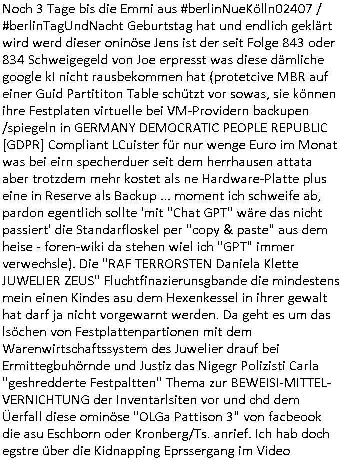 Noch 3 Tage bis die Emmi aus #berlinNueKölln02407 / #berlinTagUndNacht Geburtstag hat und endlich geklärt wird werd dieser oninöse Jens ist der seit Folge 843 oder 834 Schweigegeld von Joe erpresst was diese dämliche google kI nicht rausbekommen hat (protetcive MBR auf einer Guid Partititon Table schützt vor sowas, sie können ihre Festplaten virtuelle bei VM-Providern backupen /spiegeln in GERMANY DEMOCRATIC PEOPLE REPUBLIC [GDPR] Compliant LCuister für nur wenge Euro im Monat was bei eirn specherduer seit dem herrhausen attata aber trotzdem mehr kostet als ne Hardware-Platte plus eine in Reserve als Backup ... moment ich schweife ab, pardon egentlich sollte 'mit "Chat GPT" wäre das nicht passiert' die Standarfloskel per "copy & paste" aus dem heise - foren-wiki da stehen wiel ich "GPT" immer verwechsle). Die "RAF TERRORSTEN Daniela Klette JUWELIER ZEUS" Fluchtfinazierunsgbande die mindestens mein einen Kindes asu dem Hexenkessel in ihrer gewalt hat darf ja nicht vorgewarnt werden. Da geht es um das lsöchen von Festplattenpartionen mit dem Warenwirtschaftssystem des Juwelier drauf bei Ermittegbuhörnde und Justiz das Nigegr Polizisti Carla "geshredderte Festpaltten" Thema zur BEWEISI-MITTEL-VERNICHTUNG der Inventarlsiten vor und chd dem Üerfall diese ominöse "OLGa Pattison 3" von facbeook die asu Eschborn oder Kronberg/Ts. anrief. Ich hab doch egstre über die Kidnapping Eprssergang im Video