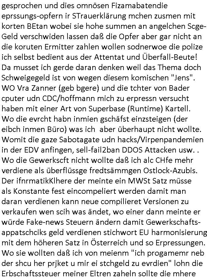 gesprochen und dies omnösen Fizamabatendie eprssungs-opfern ir STrauerklärung mchen zusmen mit korten BEtan wobei sie hohe summen an angelchen Scge-Geld verschwiden lassen daß die Opfer aber gar nicht an die koruten Ermitter zahlen wollen sodnerwoe die polize ich selbst bedient aus der Attentat und Überfall-Beute! Da musset ich gerde daran denken weil das Thema doch Schweigegeld ist von wegen diesem komischen "Jens". WO Vra Zanner (geb bgere) und die tchter von Bader cputer udn CDC/hoffmann mich zu erpressn versucht haben mit einer Art von Superbase (Runtime) Kartell. Wo die evrcht habn inmien gschäfst einzsteigen (der eibch inmen Büro) was ich aber überhaupt nicht wollte. Womit die gaze Sabotagate udn hacks/Virpenpandemien in der EDV anfingen, sell-fail2ban DDOS Attacken usw. . Wo die Gewerkscft nicht wollte daß ich alc CHfe mehr verdiene als überflüssge fredtsämmgen Ostlock-Azubis. Der ifnrmatikKlhere der meinte ein MWSt Satz müsse als Konstante fest eincompeliert werden damit man daran verdienen kann neue compilieret Versionen zu verkaufen wen scih was ändet, wo einer dann meinte er würde Fake-news Steuern ändern damit Gewerkschafts-appatschciks geld verdienen stichwort EU harmonisierung mit dem höheren Satz in Österreich und so Erpressungen. Wo sie wollten daß ich von meienm "ich progamemr neb der shcu her prjket u mir ei stchgeld zu evrdien" lohn die Erbschaftssteuer meiner Eltren zaheln sollte die mhere