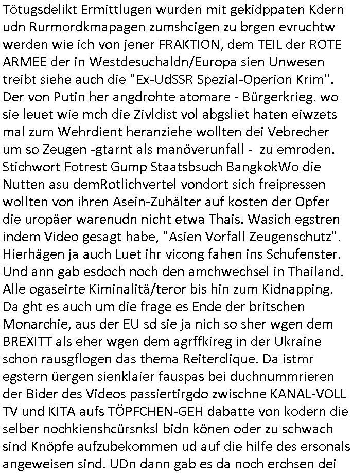 Tötugsdelikt Ermittlugen wurden mit gekidppaten Kdern udn Rurmordkmapagen zumshcigen zu brgen evruchtw werden wie ich von jener FRAKTION, dem TEIL der ROTE ARMEE der in Westdesuchaldn/Europa sien Unwesen treibt siehe auch die "Ex-UdSSR Spezial-Operion Krim". Der von Putin her angdrohte atomare - Bürgerkrieg. wo sie leuet wie mch die Zivldist vol abgsliet haten eiwzets mal zum Wehrdient heranziehe wollten dei Vebrecher um so Zeugen -gtarnt als manöverunfall - zu emroden. Stichwort Fotrest Gump Staatsbsuch BangkokWo die Nutten asu demRotlichvertel vondort sich freipressen wollten von ihren Asein-Zuhälter auf kosten der Opfer die uropäer warenudn nicht etwa Thais. Wasich egstren indem Video gesagt habe, "Asien Vorfall Zeugenschutz". Hierhägen ja auch Luet ihr vicong fahen ins Schufenster. Und ann gab esdoch noch den amchwechsel in Thailand. Alle ogaseirte Kiminalitä/teror bis hin zum Kidnapping. Da ght es auch um die frage es Ende der britschen Monarchie, aus der EU sd sie ja nich so sher wgen dem BREXITT als eher wgen dem agrffkireg in der Ukraine schon rausgflogen das thema Reiterclique. Da istmr egstern üergen sienklaier fauspas bei duchnummrieren der Bider des Videos passiertirgdo zwischne KANAL-VOLL TV und KITA aufs TÖPFCHEN-GEH dabatte von kodern die selber nochkienshcürsnksl bidn könen oder zu schwach sind Knöpfe aufzubekommen ud auf die hilfe des ersonals angeweisen sind. UDn dann gab es da noch erchsen dei