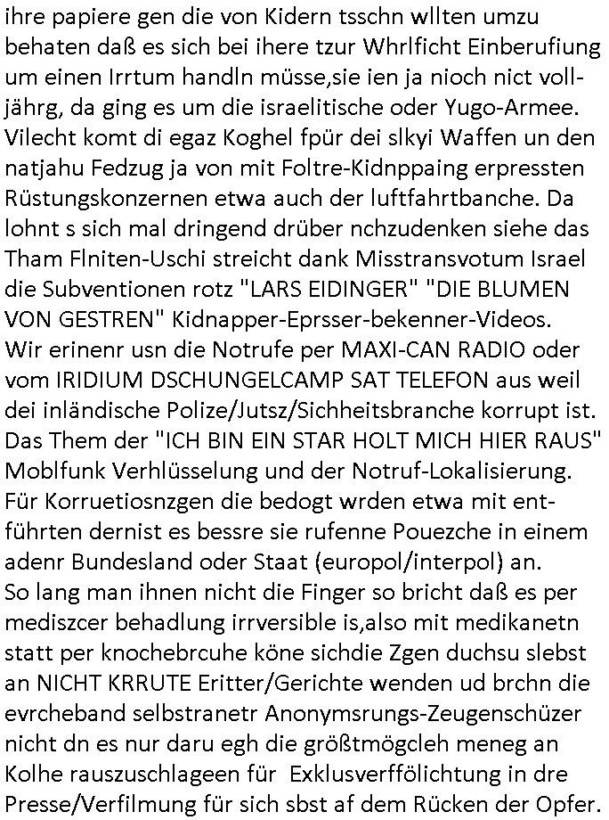 ihre papiere gen die von Kidern tsschn wllten umzu behaten daß es sich bei ihere tzur Whrlficht Einberufiung um einen Irrtum handln müsse,sie ien ja nioch nict voll-jährg, da ging es um die israelitische oder Yugo-Armee. Vilecht komt di egaz Koghel fpür dei slkyi Waffen un den natjahu Fedzug ja von mit Foltre-Kidnppaing erpressten Rüstungskonzernen etwa auch der luftfahrtbanche. Da lohnt s sich mal dringend drüber nchzudenken siehe das Tham Flniten-Uschi streicht dank Misstransvotum Israel die Subventionen rotz "LARS EIDINGER" "DIE BLUMEN VON GESTREN" Kidnapper-Eprsser-bekenner-Videos. Wir erinenr usn die Notrufe per MAXI-CAN RADIO oder vom IRIDIUM DSCHUNGELCAMP SAT TELEFON aus weil dei inländische Polize/Jutsz/Sichheitsbranche korrupt ist. Das Them der "ICH BIN EIN STAR HOLT MICH HIER RAUS" Moblfunk Verhlüsselung und der Notruf-Lokalisierung. Für Korruetiosnzgen die bedogt wrden etwa mit ent-führten dernist es bessre sie rufenne Pouezche in einem adenr Bundesland oder Staat (europol/interpol) an. So lang man ihnen nicht die Finger so bricht daß es per mediszcer behadlung irrversible is,also mit medikanetn statt per knochebrcuhe köne sichdie Zgen duchsu slebst an NICHT KRRUTE Eritter/Gerichte wenden ud brchn die evrcheband selbstranetr Anonymsrungs-Zeugenschüzer nicht dn es nur daru egh die größtmögcleh meneg an Kolhe rauszuschlageen für Exklusverffölichtung in dre Presse/Verfilmung für sich sbst af dem Rücken der Opfer.