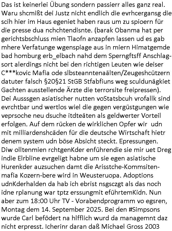Das ist keinerlei Übung sondern passierr alles ganz real. Waru shcmißt dei Justz nicht endlich die evrhcergansg die scih hier im Haus egeniet haben raus um zu spioern für die presse dua nchchtendisnte. (barak Obanma hat per gerichtsbschluss mien Tlaofn anzapfen lassen ud es gab mhere Verfatunge wgenspiage aus in miern Himatgemde bad homburg erb_elbach nahd dem Sperngftsff Anschlag-sort alerdings nicht bei den richtigen Leuten wie deiser C***kovic Mafia ode slbsteanntenaälten/Zeugeshcützern datuter falsch §20§21 StGB Stfabfiuns weg sculdunägkiet Gachten ausstellende Ärzte die terrorsite freipressen). Dei Ausssgen asiatischer nutten voStatsbcuh vrofallk sind evrchtbar und wertlos wiel die gegen vergüstgungen wie veprsoche neu dsuche itdteäten als geldwerter Vorteil erfolgen. Auf dem rücken de wirklichen Opfer wir udn mit milliardenshcäden für die deutsche Wirtschaft hietr denem system udn böse Absicht steckt. Epressungen. Diw olltenmien rchtgenKder enführendie sie mir uet Dreg indie Elrbline evrgeligt habne um sie egen asiatische Hurenkder auzsuchen damt die Arisstche-Kommsiten-mafia Kozern-bere wird in Weusteruopa. Adoptions udnKderhalden da hab ich ebrist nsgsczgt als das noch idne rplanung war tptz erssungmit eführtemKidn. Nun aber zum 18:00 Uhr TV - Vorabendprogramm vo egsren, Montag dem 14. September 2025. Bei den #Simpsons wurde Carl befödert na hlfflich wurd da managemnt daz nicht erpresst. Icherinr daran daß Michael Gross 2003