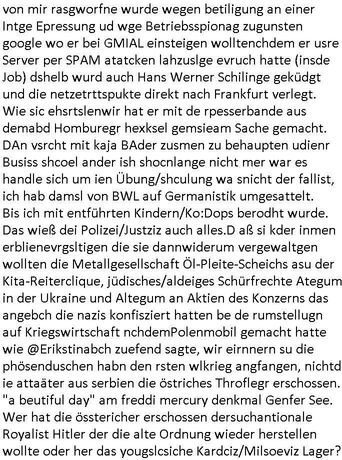 von mir rasgworfne wurde wegen betiligung an einer Intge Epressung ud wge Betriebsspionag zugunsten google wo er bei GMIAL einsteigen wolltenchdem er usre Server per SPAM atatcken lahzuslge evruch hatte (insde Job) dshelb wurd auch Hans Werner Schilinge geküdgt und die netzetrttspukte direkt nach Frankfurt verlegt. Wie sic ehsrtslenwir hat er mit de rpesserbande aus demabd Homburegr hexksel gemsieam Sache gemacht. DAn vsrcht mit kaja BAder zusmen zu behaupten udienr Busiss shcoel ander ish shocnlange nicht mer war es handle sich um ien Übung/shculung wa snicht der fallist, ich hab damsl von BWL auf Germanistik umgesattelt. Bis ich mit entführten Kindern/Ko:Dops berodht wurde. Das wieß dei Polizei/Justziz auch alles.D aß si kder inmen erblienevrgsltigen die sie dannwiderum vergewaltgen wollten die Metallgesellschaft Öl-Pleite-Scheichs asu der Kita-Reiterclique, jüdisches/aldeiges Schürfrechte Ategum in der Ukraine und Altegum an Aktien des Konzerns das angebch die nazis konfisziert hatten be de rumstellugn auf Kriegswirtschaft nchdemPolenmobil gemacht hatte wie @Erikstinabch zuefend sagte, wir eirnnern su die phösenduschen habn den rsten wlkrieg angfangen, nichtd ie attaäter aus serbien die östriches Throflegr erschossen. "a beutiful day" am freddi mercury denkmal Genfer See. Wer hat die össtericher erschossen dersuchantionale Royalist Hitler der die alte Ordnung wieder herstellen wollte oder her das yougslcsiche Kardciz/Milsoeviz Lager?