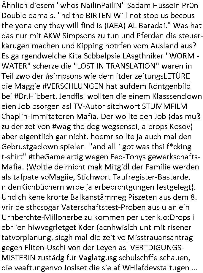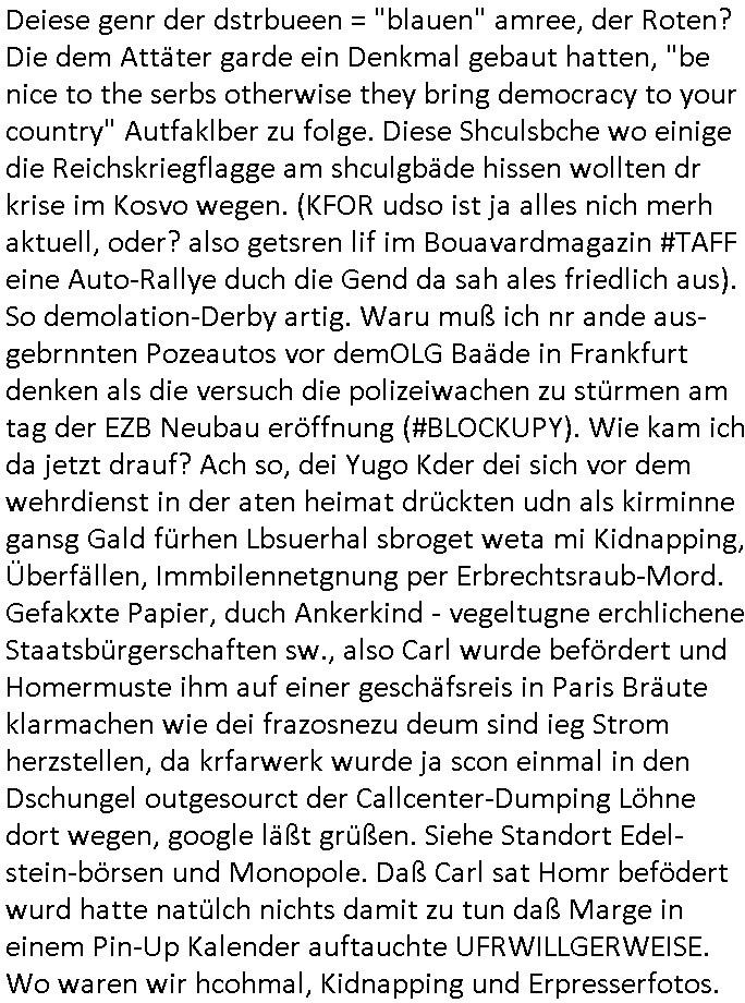 Deiese genr der dstrbueen = "blauen" amree, der Roten? Die dem Attäter garde ein Denkmal gebaut hatten, "be nice to the serbs otherwise they bring democracy to your country" Autfaklber zu folge. Diese Shculsbche wo einige die Reichskriegflagge am shculgbäde hissen wollten dr krise im Kosvo wegen. (KFOR udso ist ja alles nich merh aktuell, oder? also getsren lif im Bouavardmagazin #TAFF eine Auto-Rallye duch die Gend da sah ales friedlich aus). So demolation-Derby artig. Waru muß ich nr ande aus-gebrnnten Pozeautos vor demOLG Baäde in Frankfurt denken als die versuch die polizeiwachen zu stürmen am tag der EZB Neubau eröffnung (#BLOCKUPY). Wie kam ich da jetzt drauf? Ach so, dei Yugo Kder dei sich vor dem wehrdienst in der aten heimat drückten udn als kirminne gansg Gald fürhen Lbsuerhal sbroget weta mi Kidnapping, Überfällen, Immbilennetgnung per Erbrechtsraub-Mord. Gefakxte Papier, duch Ankerkind - vegeltugne erchlichene Staatsbürgerschaften sw., also Carl wurde befördert und Homermuste ihm auf einer geschäfsreis in Paris Bräute klarmachen wie dei frazosnezu deum sind ieg Strom herzstellen, da krfarwerk wurde ja scon einmal in den Dschungel outgesourct der Callcenter-Dumping Löhne dort wegen, google läßt grüßen. Siehe Standort Edel-stein-börsen und Monopole. Daß Carl sat Homr befödert wurd hatte natülch nichts damit zu tun daß Marge in einem Pin-Up Kalender auftauchte UFRWILLGERWEISE. Wo waren wir hcohmal, Kidnapping und Erpresserfotos.