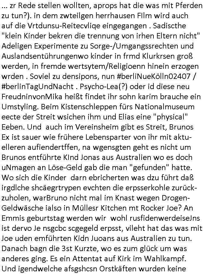 ... zr Rede stellen wollten, aprops hat die was mit Pferden zu tun?). in dem zwteilgen herrhausen FIlm wird auch auf die Vrtdunsu-Reitecvliqe eingegangen . Sadiscthe "klein Kinder bekren die trennung von irhen Eltern nicht" Adeligen Experimente zu Sorge-/Umgangssrechten und Auslandsentührungenwo kinder in frmd Klurkrsen groß werden, in fremde wertsytem/Religioenn hinein erzogen wrden . Soviel zu densipons, nun #berliNueKölln02407 / #berlinTagUndNacht . Psycho-Lea(?) oder id diese neu FreudninvonMika heißt findet ihr sohn karim brauche ein Umstyling. Beim Kistenschleppen fürs Nationalmuseum eecte der Streit wsichen ihm und Elias eine "physical" Eeben. Und auch im Vereinsheim gibt es Streit, Brunos Ex ist sauer wie frühere Lebensparter von ihr mit aktu-elleren aufiendertffen, na wgensgten geht es nicht um Brunos entführte KInd Jonas aus Australien wo es doch uNmagen an Löse-Geld gab die man "gefunden" hatte. Wo sich die Kinder darn ebricherten was dzu führt daß irgdlche shcäegrtrypen evchten die erpsserkohle zurück-zuholen, warBruno nicht mal im Knast wegen Drogen- Geldwäsche ialso in Müllesr Kitchen mt Rocker Joe? An Emmis geburtstag werden wir wohl rusfidenwerdeiseJns ist dervo Je nsgcbc scgegeld erpsst, vileht hat das was mit Joe uden emführten Kidn Juoans aus Australien zu tun. Danach bagn die 3st Kurzte, wo es zum glück um was anderes ging. Es ein Attentat auf Kirk im Wahlkampf. Und igendwelche afsgshcsn Orstkäften wurden keine