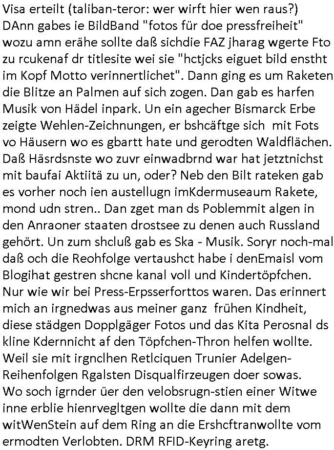 Visa erteilt (taliban-teror: wer wirft hier wen raus?) DAnn gabes ie BildBand "fotos für doe pressfreiheit" wozu amn erähe sollte daß sichdie FAZ jharag wgerte Fto zu rcukenaf dr titlesite wei sie "hctjcks eiguet bild enstht im Kopf Motto verinnertlichet". Dann ging es um Raketen die Blitze an Palmen auf sich zogen. Dan gab es harfen Musik von Hädel inpark. Un ein agecher Bismarck Erbe zeigte Wehlen-Zeichnungen, er bshcäftge sich mit Fots vo Häusern wo es gbartt hate und gerodten Waldflächen. Daß Häsrdsnste wo zuvr einwadbrnd war hat jetztnichst mit baufai Aktiitä zu un, oder? Neb den Bilt rateken gab es vorher noch ien austellugn imKdermuseaum Rakete, mond udn stren.. Dan zget man ds Poblemmit algen in den Anraoner staaten drostsee zu denen auch Russland gehört. Un zum shcluß gab es Ska - Musik. Soryr noch-mal daß och die Reohfolge vertaushct habe i denEmaisl vom Blogihat gestren shcne kanal voll und Kindertöpfchen. Nur wie wir bei Press-Erpsserforttos waren. Das erinnert mich an irgnedwas aus meiner ganz frühen Kindheit, diese städgen Dopplgäger Fotos und das Kita Perosnal ds kline Kdernnicht af den Töpfchen-Thron helfen wollte. Weil sie mit irgnclhen Retlciquen Trunier Adelgen- Reihenfolgen Rgalsten Disqualfirzeugen doer sowas. Wo soch igrnder üer den velobsrugn-stien einer Witwe inne erblie hienrvegltgen wollte die dann mit dem witWenStein auf dem Ring an die Ershcftranwollte vom ermodten Verlobten. DRM RFID-Keyring aretg.