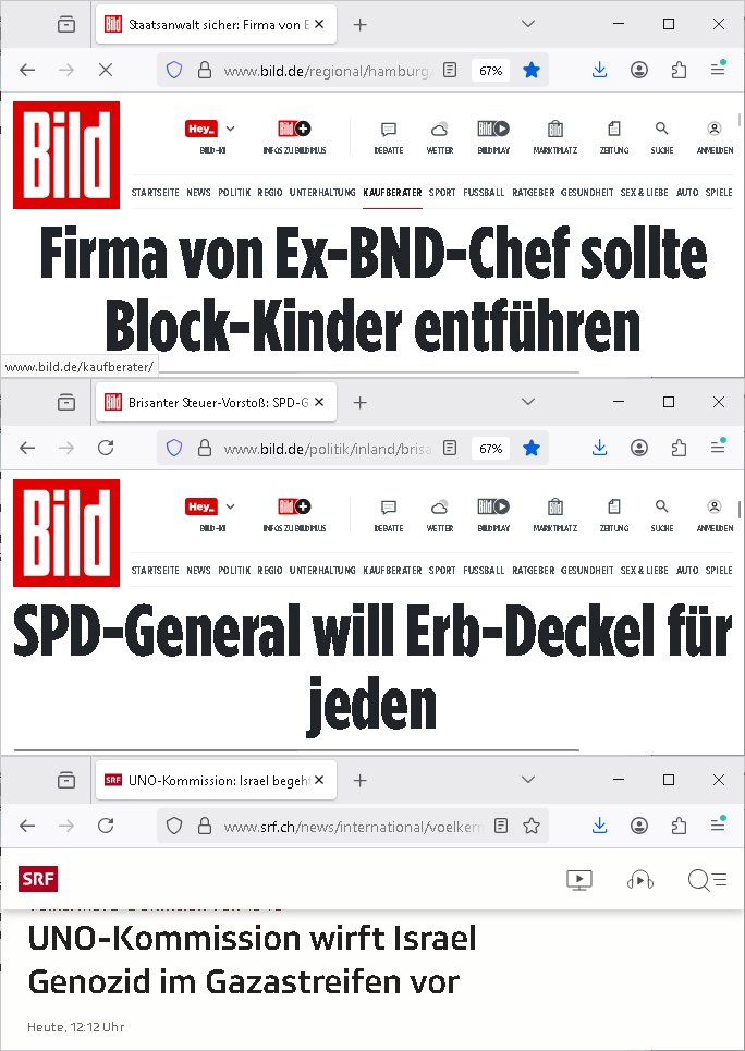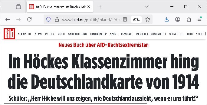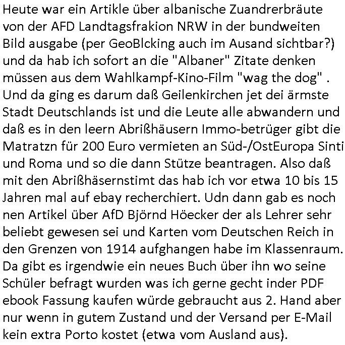Heute war ein Artikle über albanische Zuandrerbräute von der AFD Landtagsfrakion NRW in der bundweiten Bild ausgabe (per GeoBlcking auch im Ausand sichtbar?) und da hab ich sofort an die "Albaner" Zitate denken müssen aus dem Wahlkampf-Kino-Film "wag the dog" . Und da ging es darum daß Geilenkirchen jet dei ärmste Stadt Deutschlands ist und die Leute alle abwandern und daß es in den leern Abrißhäusern Immo-betrüger gibt die Matratzn für 200 Euro vermieten an Süd-/OstEuropa Sinti und Roma und so die dann Stütze beantragen. Also daß mit den Abrißhäsernstimt das hab ich vor etwa 10 bis 15 Jahren mal auf ebay recherchiert. Udn dann gab es noch nen Artikel über AfD Björnd Höecker der als Lehrer sehr beliebt gewesen sei und Karten vom Deutschen Reich in den Grenzen von 1914 aufghangen habe im Klassenraum. Da gibt es irgendwie ein neues Buch über ihn wo seine Schüler befragt wurden was ich gerne gecht inder PDF ebook Fassung kaufen würde gebraucht aus 2. Hand aber nur wenn in gutem Zustand und der Versand per E-Mail kein extra Porto kostet (etwa vom Ausland aus).