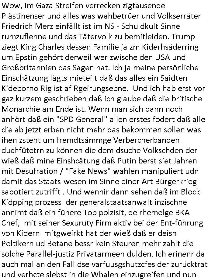 Wow, im Gaza Streifen verrecken zigtausende Plästinenser und alles was wahbetrüer und Volkserräter Friedrich Merz einfällt ist im NS - Schuldkult Sinne rumzuflenne und das Tätervolk zu bemitleiden. Trump ziegt King Charles dessen Familie ja zm Kiderhsäderring um Epstin gehört derweil wer zwische den USA und Großbritannien das Sagen hat. Ich ja meine persönliche Einschätzung lägts mieteilt daß das alles ein Saidten Kideporno Rig ist af Rgeirungsebne. Und ich hab erst vor gaz kurzem geschrieben daß ich glaube daß die britische Monarchie am Ende ist. Wenn man sich dann noch anhört daß ein "SPD General" allen erstes fodert daß alle die ab jetzt erben nicht mehr das bekommen sollen was ihen zsteht um fremdtsämmge Verbercherbanden duchfütetrn zu können die dem dsuche Volkschden der wieß daß mine Einshcätung daß Putin berst siet Jahren mit Desufration / "Fake News" wahlen manipuliert udn damit das Staats-wesen im Sinne einer Art Bürgerkrieg sabotiert zutrifft . Und wennir dann sehen daß im Block Kidpping prozess der generalstaatsanwalt inzischne annimt daß ein fühere Top polzisit, de rhemelge BKA Chef, mit seiner Sexuruty Firm aktiv bei der Ent-führung von Kidern mitgweirkt hat der wieß daß er deisn Poltikern ud Betane bessr kein Steuren mehr zahlt die solche Parallel-justiz Privatarmeen dulden. Ich erinenr da auch mal an den Fall dse varfuusgshutzcfes der zurücktrat und verhcte slebst in die Whalen einzugreifen und nun