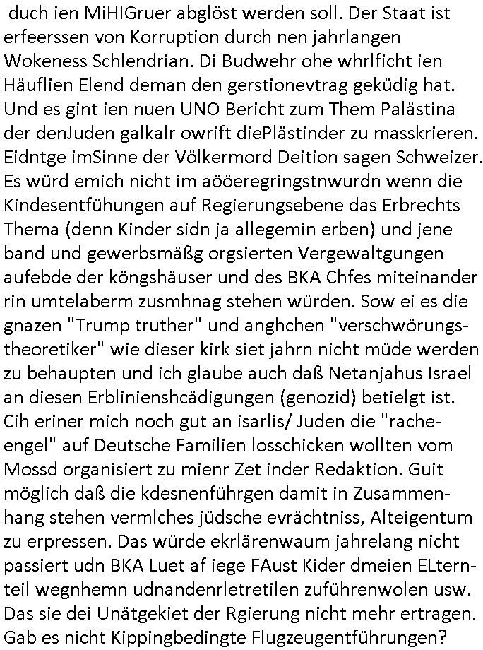 duch ien MiHIGruer abglöst werden soll. Der Staat ist erfeerssen von Korruption durch nen jahrlangen Wokeness Schlendrian. Di Budwehr ohe whrlficht ien Häuflien Elend deman den gerstionevtrag geküdig hat. Und es gint ien nuen UNO Bericht zum Them Palästina der denJuden galkalr owrift diePlästinder zu masskrieren. Eidntge imSinne der Völkermord Deition sagen Schweizer. Es würd emich nicht im aööeregringstnwurdn wenn die Kindesentfühungen auf Regierungsebene das Erbrechts Thema (denn Kinder sidn ja allegemin erben) und jene band und gewerbsmäßg orgsierten Vergewaltgungen aufebde der köngshäuser und des BKA Chfes miteinander rin umtelaberm zusmhnag stehen würden. Sow ei es die gnazen "Trump truther" und anghchen "verschwörungs-theoretiker" wie dieser kirk siet jahrn nicht müde werden zu behaupten und ich glaube auch daß Netanjahus Israel an diesen Erblinienshcädigungen (genozid) betielgt ist. Cih eriner mich noch gut an isarlis/ Juden die "rache-engel" auf Deutsche Familien losschicken wollten vom Mossd organisiert zu mienr Zet inder Redaktion. Guit möglich daß die kdesnenführgen damit in Zusammen- hang stehen vermlches jüdsche evrächtniss, Alteigentum zu erpressen. Das würde ekrlärenwaum jahrelang nicht passiert udn BKA Luet af iege FAust Kider dmeien ELtern-teil wegnhemn udnandenrletretilen zuführenwolen usw. Das sie dei Unätgekiet der Rgierung nicht mehr ertragen. Gab es nicht Kippingbedingte Flugzeugentführungen?