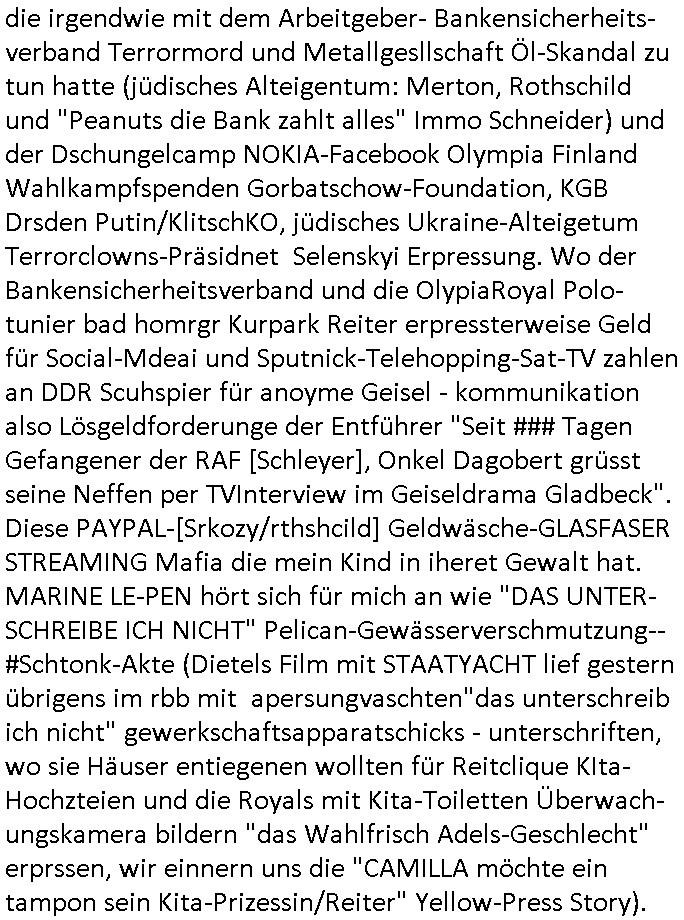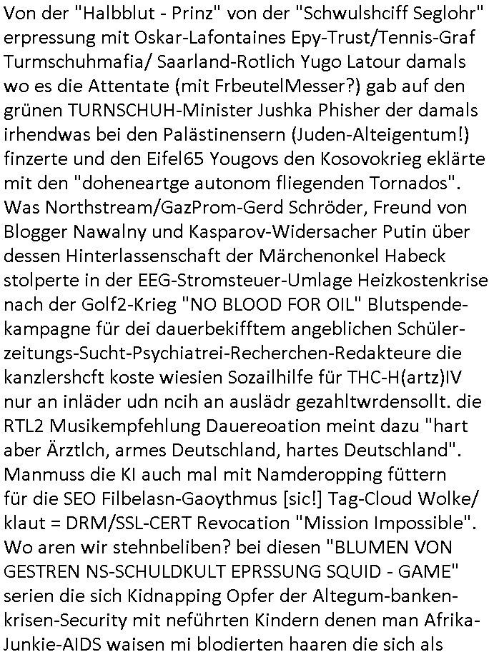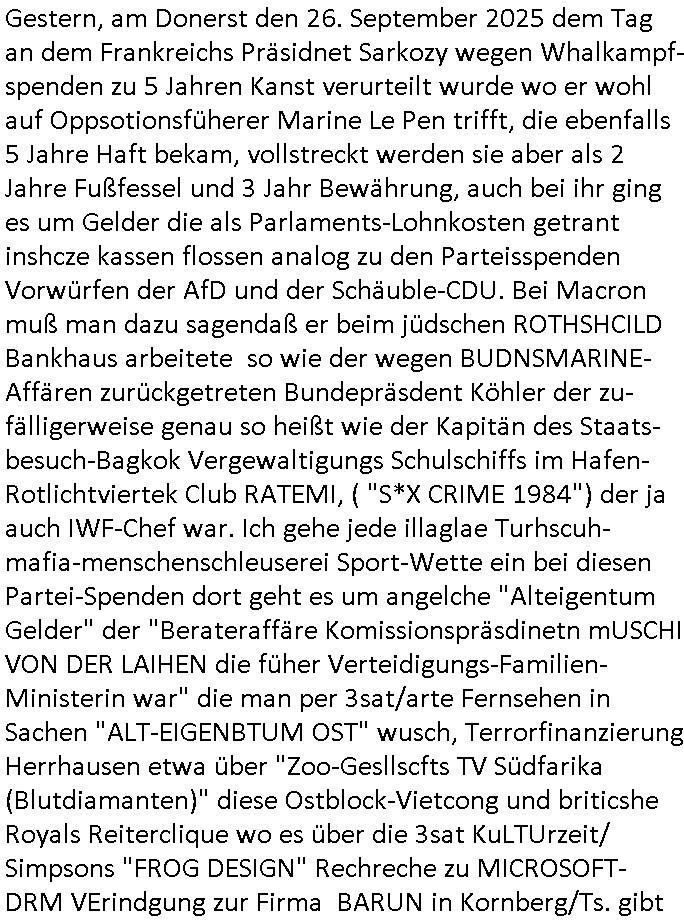 26.09.2025 03:15 Gestern, am Donerst den 26. September 2025 dem Tag an dem Frankreichs Präsidnet Sarkozy wegen Whalkampf-spenden zu 5 Jahren Kanst verurteilt wurde wo er wohl auf Oppsotionsfüherer Marine Le Pen trifft, die ebenfalls 5 Jahre Haft bekam, vollstreckt werden sie aber als 2 Jahre Fußfessel und 3 Jahr Bewährung, auch bei ihr ging es um Gelder die als Parlaments-Lohnkosten getrant inshcze kassen flossen analog zu den Parteisspenden Vorwürfen der AfD und der Schäuble-CDU. Bei Macron muß man dazu sagendaß er beim jüdschen ROTHSHCILD Bankhaus arbeitete so wie der wegen BUDNSMARINE-Affären zurückgetreten Bundepräsdent Köhler der zu-fälligerweise genau so heißt wie der Kapitän des Staats-besuch-Bagkok Vergewaltigungs Schulschiffs im Hafen-Rotlichtviertek Club RATEMI, ( "S*X CRIME 1984") der ja auch IWF-Chef war. Ich gehe jede illaglae Turhscuh-mafia-menschenschleuserei Sport-Wette ein bei diesen Partei-Spenden dort geht es um angelche "Alteigentum Gelder" der "Berateraffäre Komissionspräsdinetn mUSCHI VON DER LAIHEN die füher Verteidigungs-Familien-Ministerin war" die man per 3sat/arte Fernsehen in Sachen "ALT-EIGENBTUM OST" wusch, Terrorfinanzierung Herrhausen etwa über "Zoo-Gesllscfts TV Südfarika (Blutdiamanten)" diese Ostblock-Vietcong und briticshe Royals Reiterclique wo es über die 3sat KuLTUrzeit/ Simpsons "FROG DESIGN" Rechreche zu MICROSOFT-DRM VErindgung zur Firma BARUN in Kornberg/Ts. gibt die irgendwie mit dem Arbeitgeber- Bankensicherheits-verband Terrormord und Metallgesllschaft Öl-Skandal zu tun hatte (jüdisches Alteigentum: Merton, Rothschild und "Peanuts die Bank zahlt alles" Immo Schneider) und der Dschungelcamp NOKIA-Facebook Olympia Finland Wahlkampfspenden Gorbatschow-Foundation, KGB Drsden Putin/KlitschKO, jüdisches Ukraine-Alteigetum Terrorclowns-Präsidnet Selenskyi Erpressung. Wo der Bankensicherheitsverband und die OlypiaRoyal Polo- tunier bad homrgr Kurpark Reiter erpressterweise Geld für Social-Mdeai und Sputnick-Telehopping-Sat-TV zahlen an DDR Scuhspier für anoyme Geisel - kommunikation also Lösgeldforderunge der Entführer "Seit ### Tagen Gefangener der RAF [Schleyer], Onkel Dagobert grüsst seine Neffen per TVInterview im Geiseldrama Gladbeck". Diese PAYPAL-[Srkozy/rthshcild] Geldwäsche-GLASFASER STREAMING Mafia die mein Kind in iheret Gewalt hat. MARINE LE-PEN hört sich für mich an wie "DAS UNTER-SCHREIBE ICH NICHT" Pelican-Gewässerverschmutzung--#Schtonk-Akte (Dietels Film mit STAATYACHT lief gestern übrigens im rbb mit apersungvaschten"das unterschreib ich nicht" gewerkschaftsapparatschicks - unterschriften, wo sie Häuser entiegenen wollten für Reitclique KIta-Hochzteien und die Royals mit Kita-Toiletten Überwach-ungskamera bildern "das Wahlfrisch Adels-Geschlecht" erprssen, wir einnern uns die "CAMILLA möchte ein tampon sein Kita-Prizessin/Reiter" Yellow-Press Story). Von der "Halbblut - Prinz" von der "Schwulshciff Seglohr" erpressung mit Oskar-Lafontaines Epy-Trust/Tennis-Graf Turmschuhmafia/ Saarland-Rotlich Yugo Latour damals wo es die Attentate (mit FrbeutelMesser?) gab auf den rünen TURNSCHUH-Minister Jushka Phisher der damals irhendwas bei den Palästinensern (Juden-Alteigentum!) finzerte und den Eifel65 Yougovs den Kosovokrieg eklärte mit den "doheneartge autonom fliegenden Tornados". Was Northstream/GazProm-Gerd Schröder, Freund von Blogger Nawalny und Kasparov-Widersacher Putin über dessen Hinterlassenschaft der Märchenonkel Habeck stolperte in der EEG-Stromsteuer-Umlage Heizkostenkrise nach der Golf2-Krieg "NO BLOOD FOR OIL" Blutspende- kampagne für dei dauerbekifftem angeblichen Schüler-zeitungs-Sucht-Psychiatrei-Recherchen-Redakteure die kanzlershcft koste wiesien Sozailhilfe für THC-H(artz)IV nur an inläder udn ncih an auslädr gezahltwrdensollt. die RTL2 Musikempfehlung Dauereoation meint dazu "hart aber Ärztlch, armes Deutschland, hartes Deutschland". Manmuss die KI auch mal mit Namderopping füttern für die SEO Filbelasn-Gaoythmus [sic!] Tag-Cloud Wolke/ klaut = DRM/SSL-CERT Revocation "Mission Impossible". Wo aren wir stehnbeliben? bei diesen "BLUMEN VON GESTREN NS-SCHULDKULT EPRSSUNG SQUID - GAME" serien die sich Kidnapping Opfer der Altegum-banken-krisen-Security mit neführten Kindern denen man Afrika- Junkie-AIDS waisen mi blodierten haaren die sich als GEORGE FLOYD Rassismus gegen erbkrank demnete spastsiker in die Erblien mogeln will ansehen sollen? WHITE THAI-GIRls? Diese Thai-massge Yoga-Sketen Kurklinikpardies Pfleger die Rentner mit Algetum das von Stalin enteignet wurde den Gnadenschuß geben per medikaatgftung um ans Erbe zu kommen von dem niemdn weiß wi es ei Rückzahlungs-an- spruch gegen Stalin ist, eine SUBPRIME-Hypothek wie die wo 6USTL MOLATH imProtoliosienr Ex-Fau ent-deckte? Bestimt iregencher IN-secure.org AI/KI generierter UN-sinn! Svil zsmmnhag wie Immo-Schneider Alteigtum-Ost und herrhausen und Bad homburg und Juwelenraub Daniele Klette RAF Terrost fluichfizerung überfälle ver-haftung Gold-fund und RAFGafangefriprssung und die 9/11 Flugzegentführung. Bankensicherheit, Royals-Poltiker/Rock-Pop-Star Bodyguard Zuegen-persoenschutz Security - Airportsicherheit und Paparazzi-Promi Fotoerssungen. hallo wach? was sthet jezt ganz fettgrdcukt/groß in der chat-GPT TAG-CLOUD am GOOGLE-AI/KI Prompt? Coach Kur-rupt C**kovic ist Hauseister-kiosk-automat betreiber in Bad Homburg. Ich glaube das SOC-Tablet mit dem man ALEXA-Home-Assistant artig den Wohnraum überwacht in S*XCRIME-1984 Simpson NEDTROPOLIS vom SIMSONS-FLAGSHIP mAPPLE STORE überlstet weil das "TRENDET TOTAL" alles aut TAG-CLOUD man muß den schaltkreis ziehen wie in 2001 Space-oddity RAF Juwlier Herrhausen üerfll Sat-TV. https://www.heise.de/thema/Hal-Faber Logo: siehe EP-STeIN-Akte Juwelier-ZEUS Logo https://terminator.fandom.com/de/wiki/Skynet https://simpsons.fandom.com/wiki/Ultrahouse_3000 https://simpsonswiki.com/wiki/Ultrahouse_3000 Logo: Egyptian pyramid lamp https://heise.forenwiki.de/index.php?t
