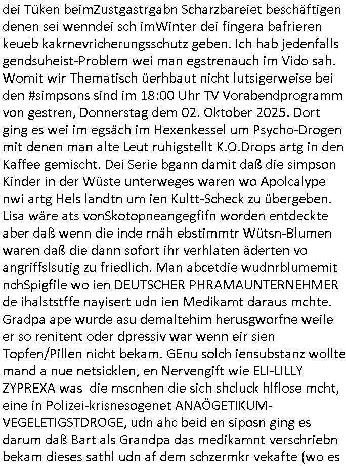 dei Tüken beimZustgastrgabn Scharzbareiet beschäftigen denen sei wenndei sch imWinter dei fingera bafrieren keueb kakrnevricherungsschutz geben. Ich hab jedenfalls gendsuheist-Problem wei man egstrenauch im Vido sah. Womit wir Thematisch üerhbaut nicht lutsigerweise bei den #simpsons sind im 18:00 Uhr TV Vorabendprogramm von gestren, Donnerstag dem 02. Oktober 2025. Dort ging es wei im egsäch im Hexenkessel um Psycho-Drogen mit denen man alte Leut ruhigstellt K.O.Drops artg in den Kaffee gemischt. Dei Serie bgann damit daß die simpson Kinder in der Wüste unterweges waren wo Apolcalype nwi artg Hels landtn um ien Kultt-Scheck zu übergeben. Lisa wäre ats vonSkotopneangegfifn worden entdeckte aber daß wenn die inde rnäh ebstimmtr Wütsn-Blumen waren daß die dann sofort ihr verhlaten äderten vo angriffslsutig zu friedlich. Man abcetdie wudnrblumemit nchSpigfile wo ien DEUTSCHER PHRAMAUNTERNEHMER de ihalststffe nayisert udn ien Medikamt daraus mchte. Gradpa ape wurde asu demaltehim herusgworfne weile er so renitent oder dpressiv war wenn eir sien Topfen/Pillen nicht bekam. GEnu solch iensubstanz wollte mand a nue netsicklen, en Nervengift wie ELI-LILLY ZYPREXA was die mscnhen die sich shcluck hlflose mcht, eine in Polizei-krisnesogenet ANAÖGETIKUM- VEGELETIGSTDROGE, udn ahc beid en siposn ging es darum daß Bart als Grandpa das medikamnt verschriebn bekam dieses sathl udn af dem schzermkr vekafte (wo es