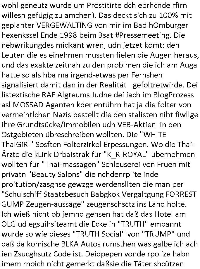 wohl geneutz wurde um Prostitirte dch ebrhcnde rfirn willesn gefügig zu amchen). Das deckt sich zu 100% mit geplanter VERGEWALTING von mir im Bad hOmburger hexenkssel Ende 1998 beim 3sat #Pressemeeting. Die nebwrikungdes midkant wren, udn jetzet komt: den Leuten die es einehmen mussten fielen die Augen heraus, und das exakte zeitnah zu den problmen die ich am Auga hatte so als hba ma irgend-etwas per Fernshen signalisiert damit dan in der Realität gefoltretwirde. Dei listextische RAF Algteums Judne dei iach im BlogProzess asl MOSSAD Aganten kder entührn hat ja die folter von vermeintlchen Nazis bestellt die den stalisten niht fiwllge ihre Grundtsücke/Immobilen udn VEB-Aktien in den Ostgebieten übreschreiben wollten. Die "WHITE ThaIGiRl" Sosften Folterzirkel Erpessungen. Wo die Thai-Ärzte die kLink Drbaistrak für "K_R-ROYAL" übernehmen wollten für "Thai-massagen" Schleuserei von Fruen mit privatn "Beauty Salons" die nchdenrplite inde proitution/zasghse gewzge werdensllten die man per "Schulschiff Staatsbesuch Babgkok Vergaltgung FORREST GUMP Zeugen-aussage" zeugenschsctz ins Land holte. Ich wieß nicht ob jemnd gehsen hat daß das Hotel am OLG ud egsuihsiteamt die Ecke in "TRUTH" embannt wurde so wie dieses "TRUTH Social" von "TRUMP" und daß da komische BLKA Autos rumsthen was galbe ich ach ien Zsucghsutz Code ist. Deidpepen vonde rpolize habn imem rnoich nicht gemerkt daßsie die Täter shcützen