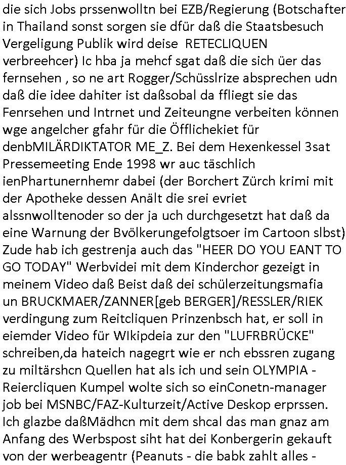 die sich Jobs prssenwolltn bei EZB/Regierung (Botschafter in Thailand sonst sorgen sie dfür daß die Staatsbesuch Vergeligung Publik wird deise RETECLIQUEN verbreehcer) Ic hba ja mehcf sgat daß die sich üer das fernsehen , so ne art Rogger/Schüsslrize absprechen udn daß die idee dahiter ist daßsobal da ffliegt sie das Fenrsehen und Intrnet und Zeiteungne verbeiten können wge angelcher gfahr für die Öfflichekiet für denbMILÄRDIKTATOR ME_Z. Bei dem Hexenkessel 3sat Pressemeeting Ende 1998 wr auc täschlich ienPhartunernhemr dabei (der Borchert Zürch krimi mit der Apotheke dessen Anält die srei evriet alssnwolltenoder so der ja uch durchgesetzt hat daß da eine Warnung der Bvölkerungefolgtsoer im Cartoon slbst) Zude hab ich gestrenja auch das "HEER DO YOU EANT TO GO TODAY" Werbvidei mit dem Kinderchor gezeigt in meinem Video daß Beist daß dei schülerzeitungsmafia un BRUCKMAER/ZANNER[geb BERGER]/RESSLER/RIEK verdingung zum Reitcliquen Prinzenbsch hat, er soll in eiemder Video für WIkipdeia zur den "LUFRBRÜCKE" schreiben,da hateich nagegrt wie er nch ebssren zugang zu miltärshcn Quellen hat als ich und sein OLYMPIA - Reiercliquen Kumpel wolte sich so einConetn-manager job bei MSNBC/FAZ-Kulturzeit/Active Deskop erprssen. Ich glazbe daßMädhcn mit dem shcal das man gnaz am Anfang des Werbspost siht hat dei Konbergerin gekauft von der werbeagentr (Peanuts - die babk zahlt alles -