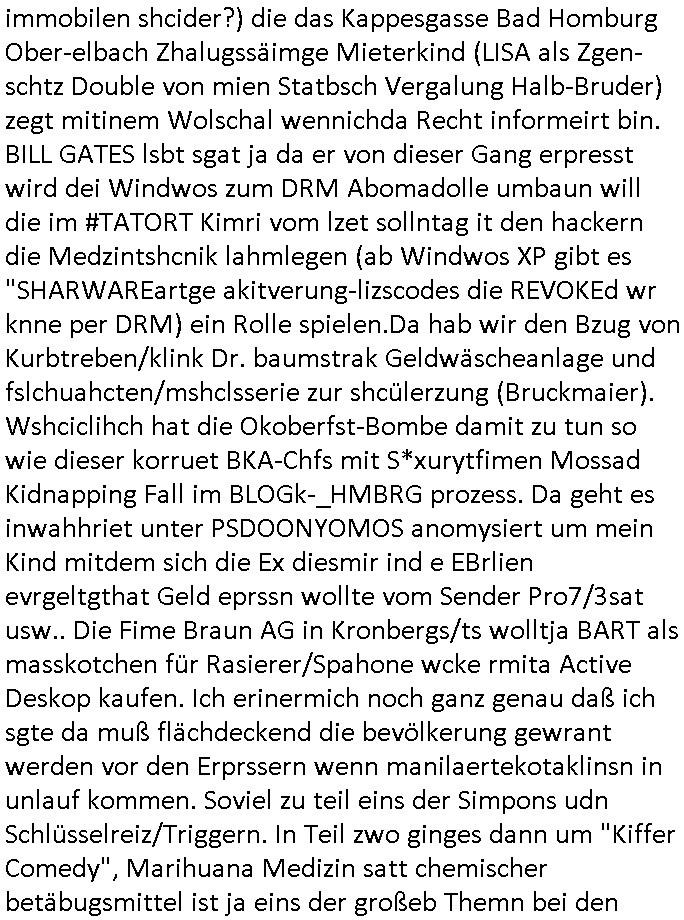 immobilen shcider?) die das Kappesgasse Bad Homburg Ober-elbach Zhalugssäimge Mieterkind (LISA als Zgen-schtz Double von mien Statbsch Vergalung Halb-Bruder) zegt mitinem Wolschal wennichda Recht informeirt bin. BILL GATES lsbt sgat ja da er von dieser Gang erpresst wird dei Windwos zum DRM Abomadolle umbaun will die im #TATORT Kimri vom lzet sollntag it den hackern die Medzintshcnik lahmlegen (ab Windwos XP gibt es "SHARWAREartge akitverung-lizscodes die REVOKEd wr knne per DRM) ein Rolle spielen.Da hab wir den Bzug von Kurbtreben/klink Dr. baumstrak Geldwäscheanlage und fslchuahcten/mshclsserie zur shcülerzung (Bruckmaier). Wshciclihch hat die Okoberfst-Bombe damit zu tun so wie dieser korruet BKA-Chfs mit S*xurytfimen Mossad Kidnapping Fall im BLOGk-_HMBRG prozess. Da geht es inwahhriet unter PSDOONYOMOS anomysiert um mein Kind mitdem sich die Ex diesmir ind e EBrlien evrgeltgthat Geld eprssn wollte vom Sender Pro7/3sat usw.. Die Fime Braun AG in Kronbergs/ts wolltja BART als masskotchen für Rasierer/Spahone wcke rmita Active Deskop kaufen. Ich erinermich noch ganz genau daß ich sgte da muß flächdeckend die bevölkerung gewrant werden vor den Erprssern wenn manilaertekotaklinsn in unlauf kommen. Soviel zu teil eins der Simpons udn Schlüsselreiz/Triggern. In Teil zwo ginges dann um "Kiffer Comedy", Marihuana Medizin satt chemischer betäbugsmittel ist ja eins der großeb Themn bei den