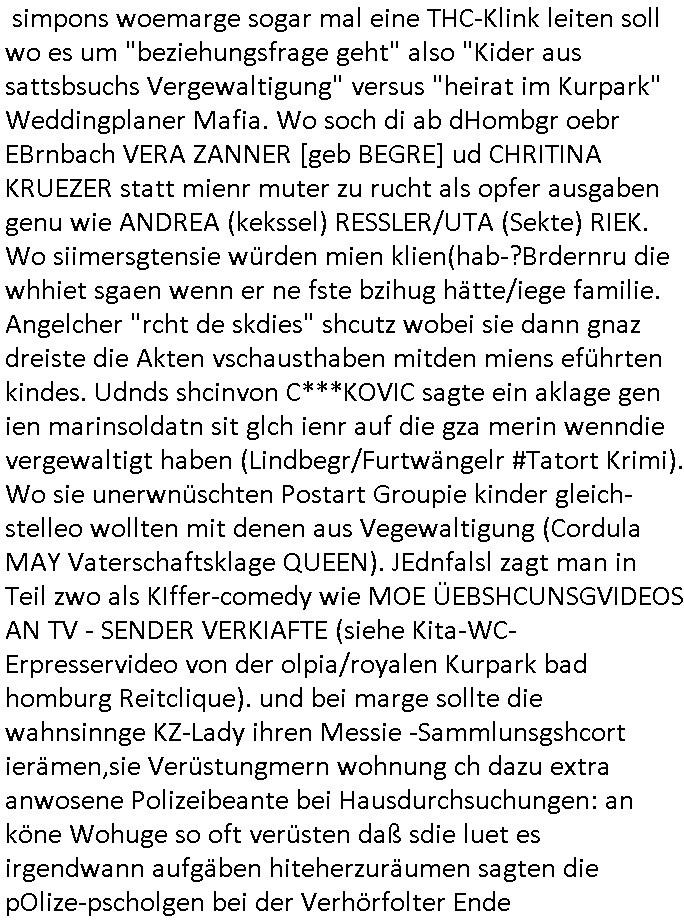 simpons woemarge sogar mal eine THC-Klink leiten soll wo es um "beziehungsfrage geht" also "Kider aus sattsbsuchs Vergewaltigung" versus "heirat im Kurpark" Weddingplaner Mafia. Wo soch di ab dHombgr oebr EBrnbach VERA ZANNER [geb BEGRE] ud CHRITINA KRUEZER statt mienr muter zu rucht als opfer ausgaben genu wie ANDREA (kekssel) RESSLER/UTA (Sekte) RIEK. Wo siimersgtensie würden mien klien(hab-?Brdernru die whhiet sgaen wenn er ne fste bzihug hätte/iege familie. Angelcher "rcht de skdies" shcutz wobei sie dann gnaz dreiste die Akten vschausthaben mitden miens eführten kindes. Udnds shcinvon C***KOVIC sagte ein aklage gen ien marinsoldatn sit glch ienr auf die gza merin wenndie vergewaltigt haben (Lindbegr/Furtwängelr #Tatort Krimi). Wo sie unerwnüschten Postart Groupie kinder gleich-stelleo wollten mit denen aus Vegewaltigung (Cordula MAY Vaterschaftsklage QUEEN). JEdnfalsl zagt man in Teil zwo als KIffer-comedy wie MOE ÜEBSHCUNSGVIDEOS AN TV - SENDER VERKIAFTE (siehe Kita-WC-Erpresservideo von der olpia/royalen Kurpark bad homburg Reitclique). und bei marge sollte die wahnsinnge KZ-Lady ihren Messie -Sammlunsgshcort ierämen,sie Verüstungmern wohnung ch dazu extra anwosene Polizeibeante bei Hausdurchsuchungen: an köne Wohuge so oft verüsten daß sdie luet es irgendwann aufgäben hiteherzuräumen sagten die pOlize-pscholgen bei der Verhörfolter Ende