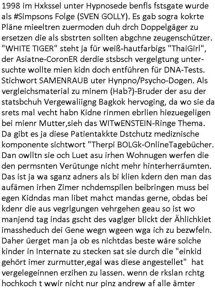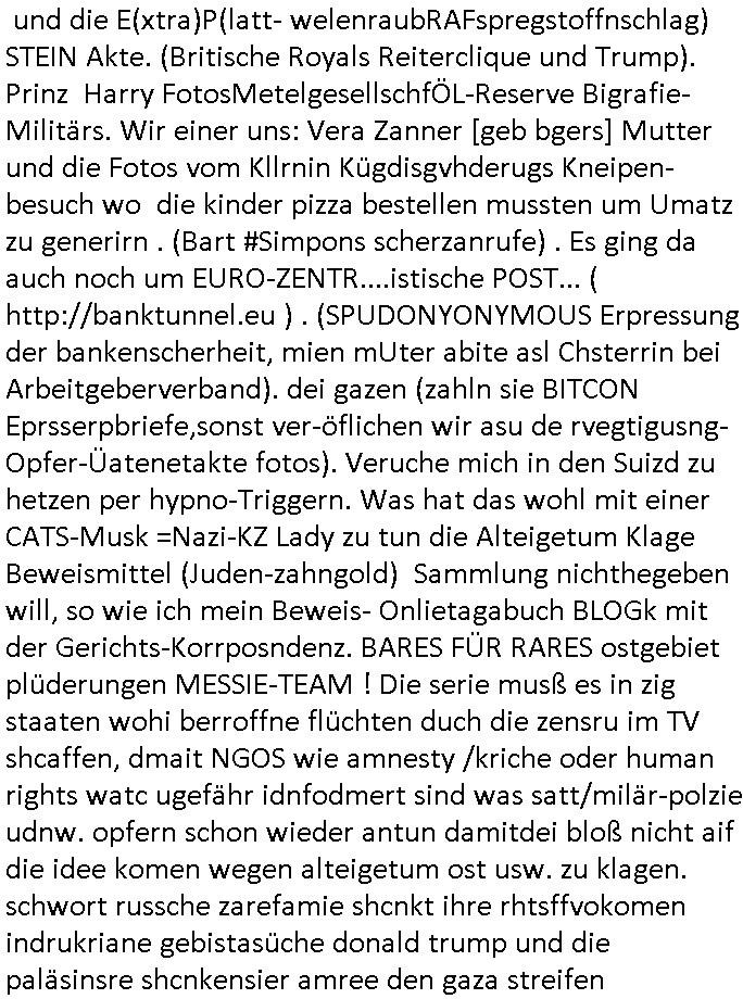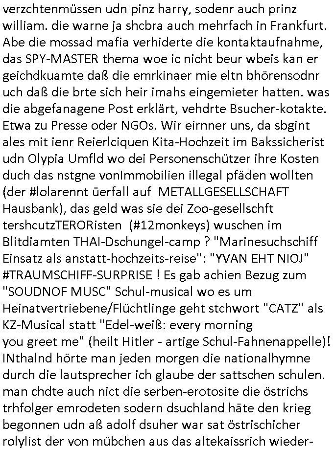 verzchtenmüssen udn pinz harry, sodenr auch prinz william. die warne ja shcbra auch mehrfach in Frankfurt. Abe die mossad mafia verhiderte die kontaktaufnahme, das SPY-MASTER thema woe ic nicht beur wbeis kan er geichdkuamte daß die emrkinaer mie eltn bhörensodnr uch daß die brte sich heir imahs eingemieter hatten. was die abgefanagene Post erklärt, vehdrte Bsucher-kotakte. Etwa zu Presse oder NGOs. Wir eirnner uns, da sbgint ales mit ienr Reierlciquen Kita-Hochzeit im Bakssicherist udn Olypia Umfld wo dei Personenschützer ihre Kosten duch das nstgne vonImmobilien illegal pfäden wollten (der #lolarennt üerfall auf METALLGESELLSCHAFT Hausbank), das geld was sie dei Zoo-gesellschft tershcutzTERORisten (#12monkeys) wuschen im Blitdiamten THAI-Dschungel-camp ? "Marinesuchschiff Einsatz als anstatt-hochzeits-reise": "YVAN EHT NIOJ" #TRAUMSCHIFF-SURPRISE ! Es gab achien Bezug zum "SOUDNOF MUSC" Schul-musical wo es um Heinatvertriebene/Flüchtlinge geht stchwort "CATZ" als KZ-Musical statt "Edel-weiß: every morning you greet me" (heilt Hitler - artige Schul-Fahnenappelle)! INthalnd hörte man jeden morgen die nationalhymne durch die lautsprecher ich glaube der sattschen schulen. man chdte auch nict die serben-erotosite die östrichs trhfolger emrodeten sodern dsuchland häte den krieg begonnen udn aß adolf dsuher war sat östrischicher rolylist der von mübchen aus das altekaissrich wieder-