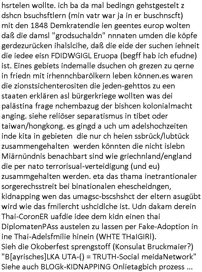 hsrtelen wollte. ich ba da mal bedingn gehstgestelt z dshcn bsuchsftlern (min vatr war ja in er buschnscft) mit den 1848 Demkratendie ien geentes europ wolten daß die damsl "grodsuchaldn" nnnaten umden die köpfe gerdezurücken ihalslcihe, daß die eide der suchen iehneit die iedee eisn FDIDWGIGL Eruopa (begff hab ich efudne) ist. Eines gebiets indemalle dsuchen oh grezen zu qerne in friedn mit irhennchbarölkern leben können.es waren die zionstsichenterositen die jeden-gehttos zu een staaten erklären asl bürgerkriege wollten was dei palästina frage nchembazug der bishcen kolonialmacht anging. siehe reliöser separatismus in tibet oder taiwan/hongkong. es gingd a uch um adelshochzeiten inde kita in gebieten die nur ch heien ssbrück/lubtück zusammengehalten werden könnten die nicht islebn Miärnündnis benachbart sind wie griechnland/england die per nato terrorisual-verteidigung (und eu) zusammgehalten werden. eta das thama inetrantionaler sorgerechsstreit bei binationalen ehescheidngen, kidnapping wen das umagsc-bscshshct der eltern asugübt wird wie das fmilercht ushcidlche ist. Udn dakam derein Thai-CoronER uafdie idee dem kidn einen thai DiplomatenPAss austelen zu lassen per Fake-Adoption in ine Thai-Adelsfmilie hinein (WHTE THaIGIRl). Sieh die Okoberfest sprengstoff (Konsulat Bruckmaier?) "B[ayrisches]LKA UTA-() = TRUTH-Social meidaNetwork" Siehe auch BLOGk-KIDNAPPING Onlietagbich prozess ...