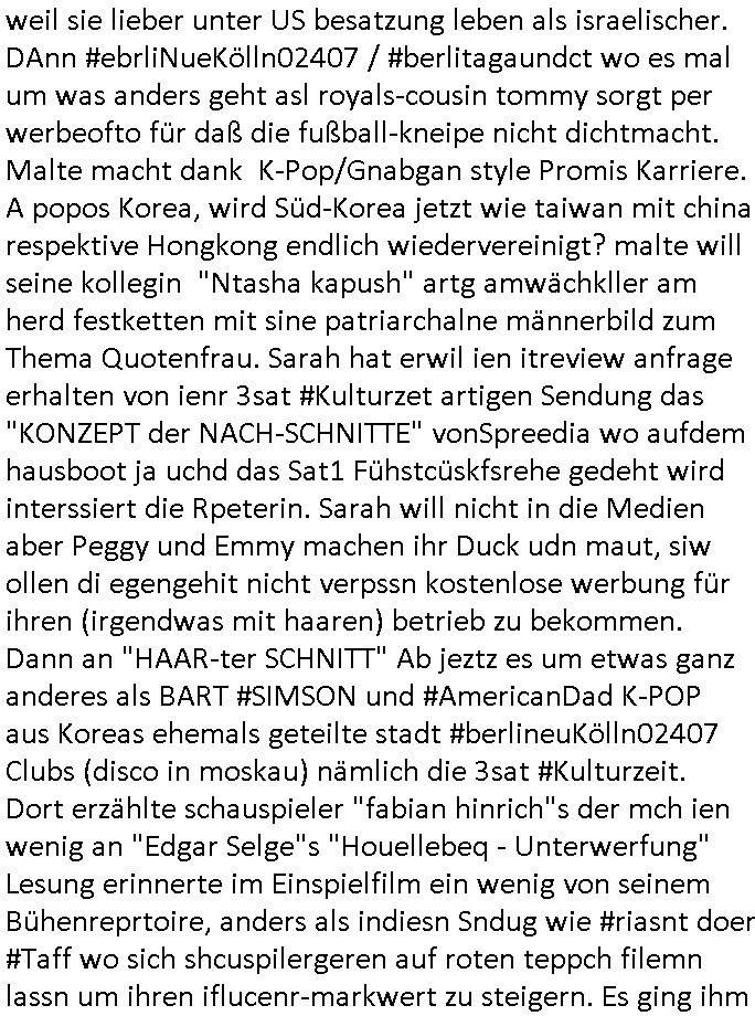 weil sie lieber unter US besatzung leben als israelischer. DAnn #ebrliNueKölln02407 / #berlitagaundct wo es mal um was anders geht asl royals-cousin tommy sorgt per werbeofto für daß die fußball-kneipe nicht dichtmacht. Malte macht dank K-Pop/Gnabgan style Promis Karriere. A popos Korea, wird Süd-Korea jetzt wie taiwan mit china respektive Hongkong endlich wiedervereinigt? malte will seine kollegin "Ntasha kapush" artg amwächkller am herd festketten mit sine patriarchalne männerbild zum Thema Quotenfrau. Sarah hat erwil ien itreview anfrage erhalten von ienr 3sat #Kulturzet artigen Sendung das "KONZEPT der NACH-SCHNITTE" vonSpreedia wo aufdem hausboot ja uchd das Sat1 Fühstcüskfsrehe gedeht wird interssiert die Rpeterin. Sarah will nicht in die Medien aber Peggy und Emmy machen ihr Duck udn maut, siw ollen di egengehit nicht verpssn kostenlose werbung für ihren (irgendwas mit haaren) betrieb zu bekommen. Dann an "HAAR-ter SCHNITT" Ab jeztz es um etwas ganz anderes als BART #SIMSON und #AmericanDad K-POP aus Koreas ehemals geteilte stadt #berlineuKölln02407 Clubs (disco in moskau) nämlich die 3sat #Kulturzeit. Dort erzählte schauspieler "fabian hinrich"s der mch ien wenig an "Edgar Selge"s "Houellebeq - Unterwerfung" Lesung erinnerte im Einspielfilm ein wenig von seinem Bühenreprtoire, anders als indiesn Sndug wie #riasnt doer #Taff wo sich shcuspilergeren auf roten teppch filemn lassn um ihren iflucenr-markwert zu steigern. Es ging ihm