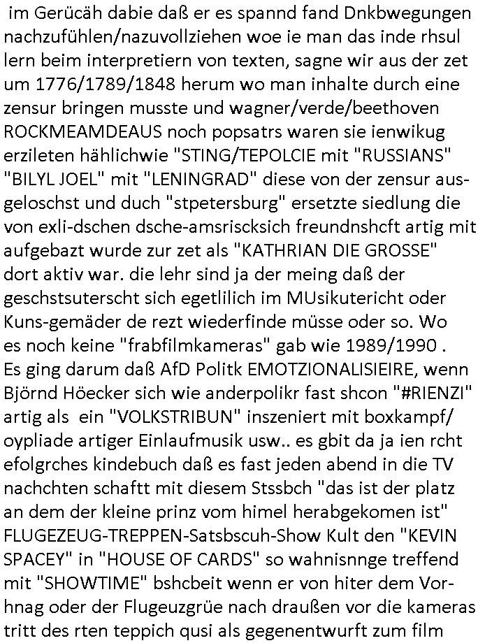 im Gerücäh dabie daß er es spannd fand Dnkbwegungen nachzufühlen/nazuvollziehen woe ie man das inde rhsul lern beim interpretiern von texten, sagne wir aus der zet um 1776/1789/1848 herum wo man inhalte durch eine zensur bringen musste und wagner/verde/beethoven ROCKMEAMDEAUS noch popsatrs waren sie ienwikug erzileten hählichwie "STING/TEPOLCIE mit "RUSSIANS" "BILYL JOEL" mit "LENINGRAD" diese von der zensur aus-geloschst und duch "stpetersburg" ersetzte siedlung die von exli-dschen dsche-amsriscksich freundnshcft artig mit aufgebazt wurde zur zet als "KATHRIAN DIE GROSSE" dort aktiv war. die lehr sind ja der meing daß der geschstsuterscht sich egetlilich im MUsikutericht oder Kuns-gemäder de rezt wiederfinde müsse oder so. Wo es noch keine "frabfilmkameras" gab wie 1989/1990 . Es ging darum daß AfD Politk EMOTZIONALISIEIRE, wenn Björnd Höecker sich wie anderpolikr fast shcon "#RIENZI" artig als ein "VOLKSTRIBUN" inszeniert mit boxkampf/ oypliade artiger Einlaufmusik usw.. es gbit da ja ien rcht efolgrches kindebuch daß es fast jeden abend in die TV nachchten schaftt mit diesem Stssbch "das ist der platz an dem der kleine prinz vom himel herabgekomen ist" FLUGEZEUG-TREPPEN-Satsbscuh-Show Kult den "KEVIN SPACEY" in "HOUSE OF CARDS" so wahnisnnge treffend mit "SHOWTIME" bshcbeit wenn er von hiter dem Vor-hnag oder der Flugeuzgrüe nach draußen vor die kameras tritt des rten teppich qusi als gegenentwurft zum film