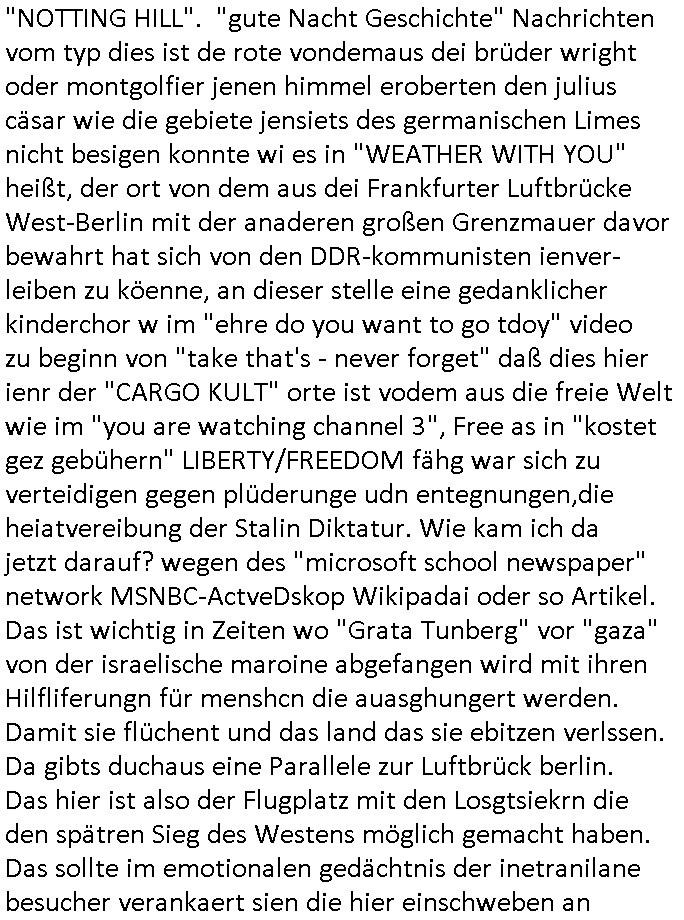 "NOTTING HILL". "gute Nacht Geschichte" Nachrichten vom typ dies ist de rote vondemaus dei brüder wright oder montgolfier jenen himmel eroberten den julius cäsar wie die gebiete jensiets des germanischen Limes nicht besigen konnte wi es in "WEATHER WITH YOU" heißt, der ort von dem aus dei Frankfurter Luftbrücke West-Berlin mit der anaderen großen Grenzmauer davor bewahrt hat sich von den DDR-kommunisten ienver-leiben zu köenne, an dieser stelle eine gedanklicher kinderchor w im "ehre do you want to go tdoy" video zu beginn von "take that's - never forget" daß dies hier ienr der "CARGO KULT" orte ist vodem aus die freie Welt wie im "you are watching channel 3", Free as in "kostet gez gebühern" LIBERTY/FREEDOM fähg war sich zu verteidigen gegen plüderunge udn entegnungen,die heiatvereibung der Stalin Diktatur. Wie kam ich da jetzt darauf? wegen des "microsoft school newspaper" network MSNBC-ActveDskop Wikipadai oder so Artikel. Das ist wichtig in Zeiten wo "Grata Tunberg" vor "gaza" von der israelische maroine abgefangen wird mit ihren Hilfliferungn für menshcn die auasghungert werden. Damit sie flüchent und das land das sie ebitzen verlssen. Da gibts duchaus eine Parallele zur Luftbrück berlin. Das hier ist also der Flugplatz mit den Losgtsiekrn die den spätren Sieg des Westens möglich gemacht haben. Das sollte im emotionalen gedächtnis der inetranilane besucher verankaert sien die hier einschweben an