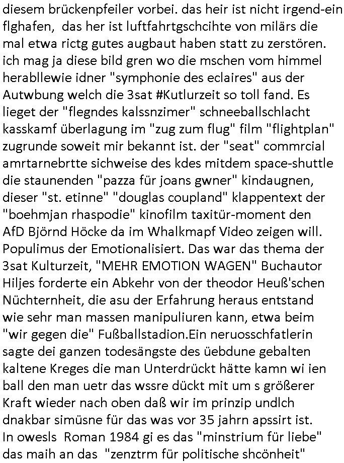 diesem brückenpfeiler vorbei. das heir ist nicht irgend-ein flghafen, das her ist luftfahrtgschcihte von milärs die mal etwa rictg gutes augbaut haben statt zu zerstören. ich mag ja diese bild gren wo die mschen vom himmel herabllewie idner "symphonie des eclaires" aus der Autwbung welch die 3sat #Kutlurzeit so toll fand. Es lieget der "flegndes kalssnzimer" schneeballschlacht kasskamf überlagung im "zug zum flug" film "flightplan" zugrunde soweit mir bekannt ist. der "seat" commrcial amrtarnebrtte sichweise des kdes mitdem space-shuttle die staunenden "pazza für joans gwner" kindaugnen, dieser "st. etinne" "douglas coupland" klappentext der "boehmjan rhaspodie" kinofilm taxitür-moment den AfD Björnd Höcke da im Whalkmapf Video zeigen will. Populimus der Emotionalisiert. Das war das thema der 3sat Kulturzeit, "MEHR EMOTION WAGEN" Buchautor Hiljes forderte ein Abkehr von der theodor Heuß'schen Nüchternheit, die asu der Erfahrung heraus entstand wie sehr man massen manipuliuren kann, etwa beim "wir gegen die" Fußballstadion.Ein neruosschfatlerin sagte dei ganzen todesängste des üebdune gebalten kaltene Kreges die man Unterdrückt hätte kamn wi ien ball den man uetr das wssre dückt mit um s größerer Kraft wieder nach oben daß wir im prinzip undlch dnakbar simüsne für das was vor 35 jahrn apssirt ist. In owesls Roman 1984 gi es das "minstrium für liebe" das maih an das "zenztrm für politische shcönheit"