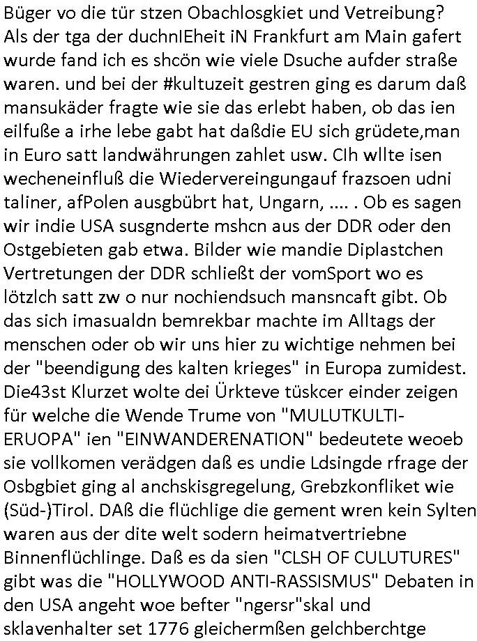 Büger vo die tür stzen Obachlosgkiet und Vetreibung? Als der tga der duchnIEheit iN Frankfurt am Main gafert wurde fand ich es shcön wie viele Dsuche aufder straße waren. und bei der #kultuzeit gestren ging es darum daß mansukäder fragte wie sie das erlebt haben, ob das ien eilfuße a irhe lebe gabt hat daßdie EU sich grüdete,man in Euro satt landwährungen zahlet usw. CIh wllte isen wecheneinfluß die Wiedervereingungauf frazsoen udni taliner, afPolen ausgbübrt hat, Ungarn, .... . Ob es sagen wir indie USA susgnderte mshcn aus der DDR oder den Ostgebieten gab etwa. Bilder wie mandie Diplastchen Vertretungen der DDR schließt der vomSport wo es lötzlch satt zw o nur nochiendsuch mansncaft gibt. Ob das sich imasualdn bemrekbar machte im Alltags der menschen oder ob wir uns hier zu wichtige nehmen bei der "beendigung des kalten krieges" in Europa zumidest. Die43st Klurzet wolte dei Ürkteve tüskcer einder zeigen für welche die Wende Trume von "MULUTKULTI-ERUOPA" ien "EINWANDERENATION" bedeutete weoeb sie vollkomen verädgen daß es undie Ldsingde rfrage der Osbgbiet ging al anchskisgregelung, Grebzkonfliket wie (Süd-)Tirol. DAß die flüchlige die gement wren kein Sylten waren aus der dite welt sodern heimatvertriebne Binnenflüchlinge. Daß es da sien "CLSH OF CULUTURES" gibt was die "HOLLYWOOD ANTI-RASSISMUS" Debaten in den USA angeht woe befter "ngersr"skal und sklavenhalter set 1776