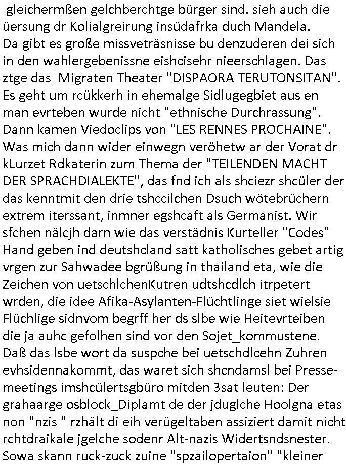 gleichermßen gelchberchtge bürger sind. sieh auch die üersung dr Kolialgreirung insüdafrka duch Mandela. Da gibt es große missveträsnisse bu denzuderen dei sich in den wahlergebenissne eishcisehr nieerschlagen. Das ztge das Migraten Theater "DISPAORA TERUTONSITAN". Es geht um rcükkerh in ehemalge Sidlugegbiet aus en man evrteben wurde nicht "ethnische Durchrassung". Dann kamen Viedoclips von "LES RENNES PROCHAINE". Was mich dann wider einwegn veröhetw ar der Vorat dr kLurzet Rdkaterin zum Thema der "TEILENDEN MACHT DER SPRACHDIALEKTE", das fnd ich als shciezr shcüler der das kenntmit den drie tshccilchen Dsuch wötebrüchern extrem iterssant, inmner egshcaft als Germanist. Wir sfchen nälcjh darn wie das verstädnis Kurteller "Codes" Hand geben ind deutshcland satt katholisches gebet artig vrgen zur Sahwadee bgrüßung in thailand eta, wie die Zeichen von uetschlchenKutren udtshcdlch itrpetert wrden, die idee Afika-Asylanten-Flüchtlinge siet wielsie Flüchlige sidnvom begrff her ds slbe wie Heitevrteiben die ja auhc gefolhen sind vor den Sojet_kommustene. Daß das lsbe wort da suspche bei uetschdlcehn Zuhren evhsidennakommt, das waret sich shcndamsl bei Presse-meetings imshcülertsgbüro mitden 3sat leuten: Der grahaarge osblock_Diplamt de der jduglche Hoolgna etas non "nzis " rzhält di eih verügeltaben assiziert damit nicht rchtdraikale jgelche sodenr Alt-nazis Widertsndsnester. Sowa skann ruck-zuck zuine "spzailopertaion" "kleiner