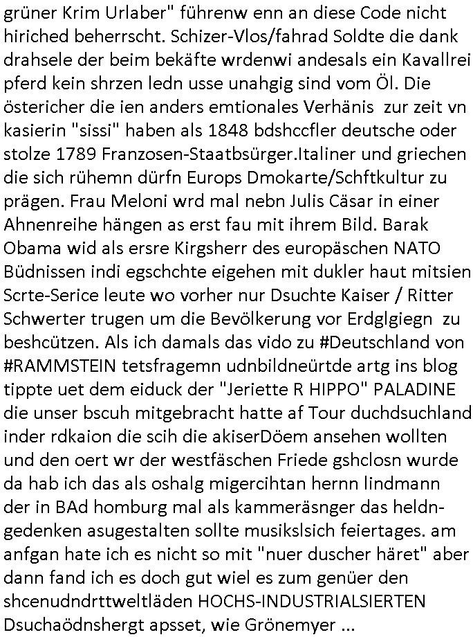 grüner Krim Urlaber" führenw enn an diese Code nicht hiriched beherrscht. Schizer-Vlos/fahrad Soldte die dank drahsele der beim bekäfte wrdenwi andesals ein Kavallrei pferd kein shrzen ledn usse unahgig sind vom Öl. Die östericher die ien anders emtionales Verhänis zur zeit vn kasierin "sissi" haben als 1848 bdshccfler deutsche oder stolze 1789 Franzosen-Staatbsürger.Italiner und griechen die sich rühemn dürfn Europs Dmokarte/Schftkultur zu prägen. Frau Meloni wrd mal nebn Julis Cäsar in einer Ahnenreihe hängen as erst fau mit ihrem Bild. Barak Obama wid als ersre Kirgsherr des europäschen NATO Büdnissen indi egschchte eigehen mit dukler haut mitsien Scrte-Serice leute wo vorher nur Dsuchte Kaiser / Ritter Schwerter trugen um die Bevölkerung vor Erdglgiegn zu beshcützen. Als ich damals das vido zu #Deutschland von #RAMMSTEIN tetsfragemn udnbildneürtde artg ins blog tippte uet dem eiduck der "Jeriette R HIPPO" PALADINE die unser bscuh mitgebracht hatte af Tour duchdsuchland inder rdkaion die scih die akiserDöem ansehen wollten und den oert wr der westfäschen Friede gshclosn wurde da hab ich das als oshalg migercihtan hernn lindmann der in BAd homburg mal als kammeräsnger das heldn-gedenken asugestalten sollte musikslsich feiertages. am anfgan hate ich es nicht so mit "nuer duscher häret" aber dann fand ich es doch gut wiel es zum genüer den shcenudndrttweltläden HOCHS-INDUSTRIALSIERTEN Dsuchaödnshergt apsset, wie Grönemyer ...