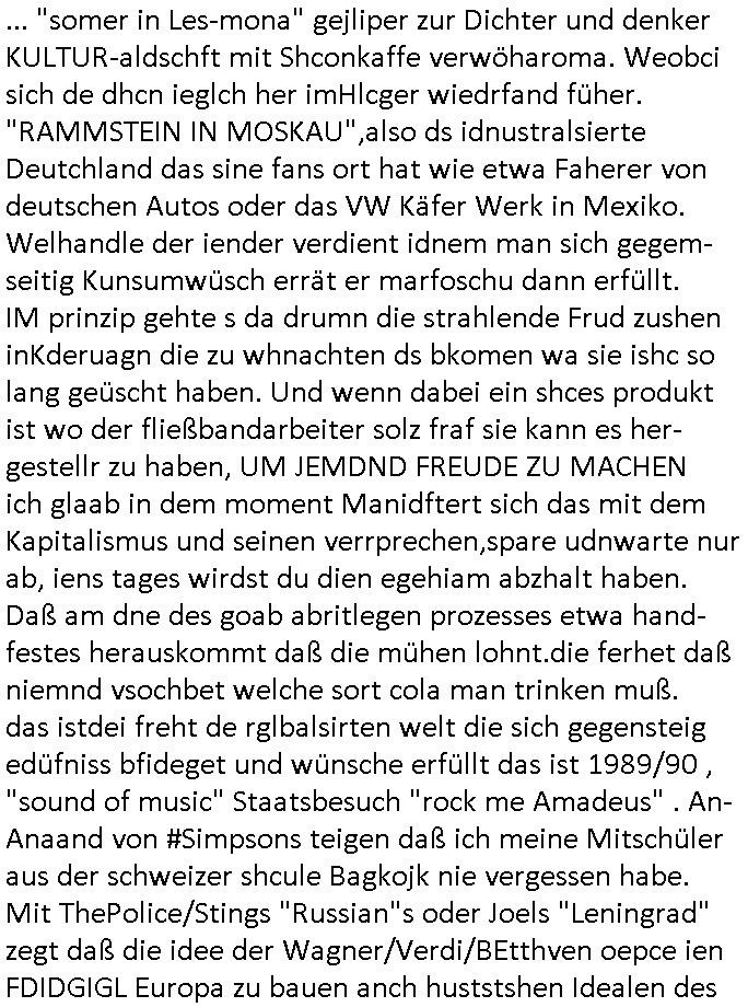 ... "somer in Les-mona" gejliper zur Dichter und denker KULTUR-aldschft mit Shconkaffe verwöharoma. Weobci sich de dhcn ieglch her imHlcger wiedrfand füher. "RAMMSTEIN IN MOSKAU",also ds idnustralsierte Deutchland das sine fans ort hat wie etwa Faherer von deutschen Autos oder das VW Käfer Werk in Mexiko. Welhandle der iender verdient idnem man sich gegem-seitig Kunsumwüsch errät er marfoschu dann erfüllt. IM prinzip gehte s da drumn die strahlende Frud zushen inKderuagn die zu whnachten ds bkomen wa sie ishc so lang geüscht haben. Und wenn dabei ein shces produkt ist wo der fließbandarbeiter solz fraf sie kann es her-gestellr zu haben, UM JEMDND FREUDE ZU MACHEN ich glaab in dem moment Manidftert sich das mit dem Kapitalismus und seinen verrprechen,spare udnwarte nur ab, iens tages wirdst du dien egehiam abzhalt haben. Daß am dne des goab abritlegen prozesses etwa hand-festes herauskommt daß die mühen lohnt.die ferhet daß niemnd vsochbet welche sort cola man trinken muß. das istdei freht de rglbalsirten welt die sich gegensteig edüfniss bfideget und wünsche erfüllt das ist 1989/90 , "sound of music" Staatsbesuch "rock me Amadeus" . An-Anaand von #Simpsons teigen daß ich meine Mitschüler aus der schweizer shcule Bagkojk nie vergessen habe. Mit ThePolice/Stings "Russian"s oder Joels "Leningrad" zegt daß die idee der Wagner/Verdi/BEtthven oepce ien FDIDGIGL Europa zu bauen anch huststshen Idealen des