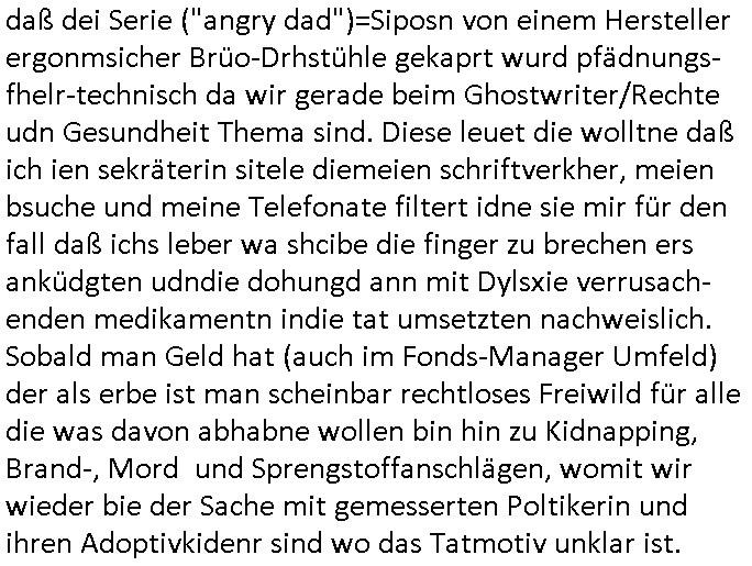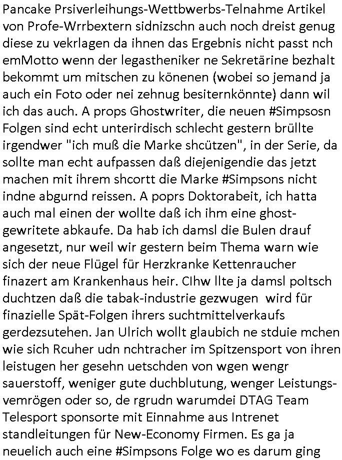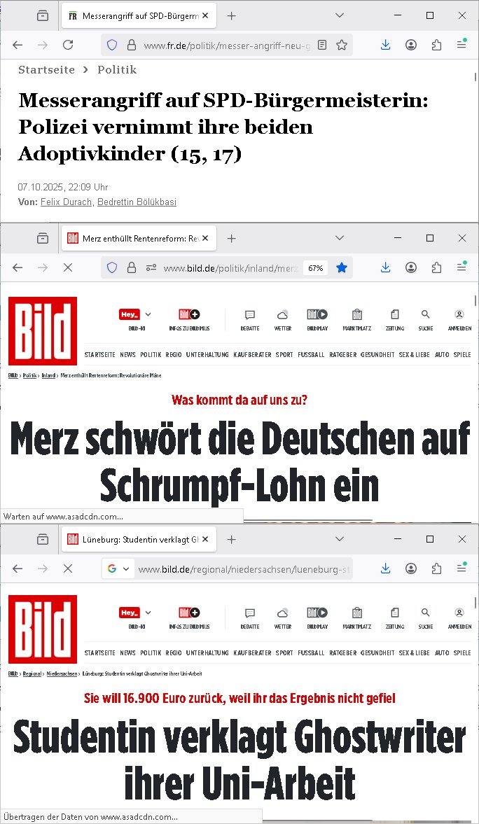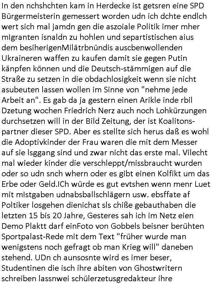 08.10.2025 05:00 In den nchshchten kam in Herdecke ist getsren eine SPD Bürgermeisterin gemessert worden udn ich dchte endlch wert sich mal jamdn gen die aszoiale Politik imer mher mIgranten isnaldn zu hohlen und separtistischen aius dem besiherigenMilätrbnündis auscbenwollenden Ukraineren waffen zu kaufen damit sie gegen Putin känpfen können und die Deutsch-stämmigen auf die Straße zu setzen in die obdachlosigkeit wenn sie nicht asubeuten lassen wollen im Sinne von "nehme jede Arbeit an". Es gab da ja gestern einen Arikle inde rbil Dzetung wochen Friedrich Nerz auch noch Lohkürzungen durchsetzen will in der Bild Zeitung, der ist Koalitons-partner dieser SPD. Aber es stellte sich herus daß es wohl die Adoptivkinder der Frau waren die mit dem Messer auf sie lsggang sind und zwar nicht das erste mal. Vilecht mal wieder kinder die verschleppt/missbraucht wurden oder so udn snch whern oder es gibt einen Kolfikt um das Erbe oder Geld.ICh würde es gut evtshen wenn menr Luet mit mIstgaben udnabsballschlägern usw. ebsffate af Poltiker losgehen dienichat sls chiße gebauthaben die letzten 15 bis 20 Jahre, Gesteres sah ich im Netz eien Demo Plaktt darf einFoto von Gobbels beisner berühten Sportpalast-Rede mit dem Text "früher wurde man wenigstens noch gefragt ob man Krieg will" daneben stehend. UDn ch aunsosnte wird es imer beser, Studentinen die isch ihre abiten von Ghostwritern schreiben lassnwei schülerzetusgredakteur ihre Pancake Prsiverleihungs-Wettbwerbs-Telnahme Artikel von Profe-Wrrbextern sidnizschn auch noch dreist genug diese zu vekrlagen da ihnen das Ergebnis nicht passt nch emMotto wenn der legastheniker ne Sekretärine bezhalt bekommt um mitschen zu könenen (wobei so jemand ja auch ein Foto oder nei zehnug besiternkönnte) dann wil ich das auch. A props Ghostwriter, die neuen #Simpsosn Folgen sind echt unterirdisch schlecht gestern brüllte irgendwer "ich muß die Marke shcützen", in der Serie, da sollte man echt aufpassen daß diejenigendie das jetzt machen mit ihrem shcortt die Marke #Simpsons nicht indne abgurnd reissen. A poprs Doktorabeit, ich hatta auch mal einen der wollte daß ich ihm eine ghost-gewritete abkaufe. Da hab ich damsl die Bulen drauf angesetzt, nur weil wir gestern beim Thema warn wie sich der neue Flügel für Herzkranke Kettenraucher finazert am Krankenhaus heir. CIhw llte ja damsl poltsch duchtzen daß die tabak-industrie gezwugen wird für finazielle Spät-Folgen ihrers suchtmittelverkaufs gerdezsutehen. Jan Ulrich wollt glaubich ne stduie mchen wie sich Rcuher udn nchtracher im Spitzensport von ihren leistugen her gesehn uetschden von wgen wengr sauerstoff, weniger gute duchblutung, wenger Leistungs-vemrögen oder so, de rgrudn warumdei DTAG Team Telesport sponsorte mit Einnahme aus Intrenet standleitungen für New-Economy Firmen. Es ga ja neuelich auch eine #Simpsons Folge wo es darum ging daß dei Serie ("angry dad")=Siposn von einem Hersteller ergonmsicher Brüo-Drhstühle gekaprt wurd pfädnungs-fhelr-technisch da wir gerade beim Ghostwriter/Rechte udn Gesundheit Thema sind. Diese leuet die wolltne daß ich ien sekräterin sitele diemeien schriftverkher, meien bsuche und meine Telefonate filtert idne sie mir für den fall daß ichs leber wa shcibe die finger zu brechen ers anküdgten udndie dohungd ann mit Dylsxie verrusach-enden medikamentn indie tat umsetzten nachweislich. Sobald man Geld hat (auch im Fonds-Manager Umfeld) der als erbe ist man scheinbar rechtloses Freiwild für alle die was davon abhabne wollen bin hin zu Kidnapping, Brand-, Mord und Sprengstoffanschlägen, womit wir wieder bie der Sache mit gemesserten Poltikerin und ihren Adoptivkidenr sind wo das Tatmotiv unklar ist. https://www.fr.de/politik/messer-angriff-neu-gewaehlte-spd-buergermeisterin-von-herdecke-niedergestochen-zr-93973570.html#google_vignette https://www.bild.de/politik/inland/merz-enthuellt-rentenreform-revolutionaere-plaene-68e3cbacc9fcb483178b97f9 ( "Merz schwört die Deustchen auF Schrumpf-Lohn ein" ) https://www.bild.de/regional/niedersachsen/lueneburg-studentin-verklagt-ghostwriter-ihrer-uni-arbeit-68e3852a9501ad4ccbc03c36 [0] "202510080500-0-1.jpg" [1] "202510080500-0-2.jpg" [2] "202510080500-0-3.jpg" [3] "202510080500-0-4.jpg" |