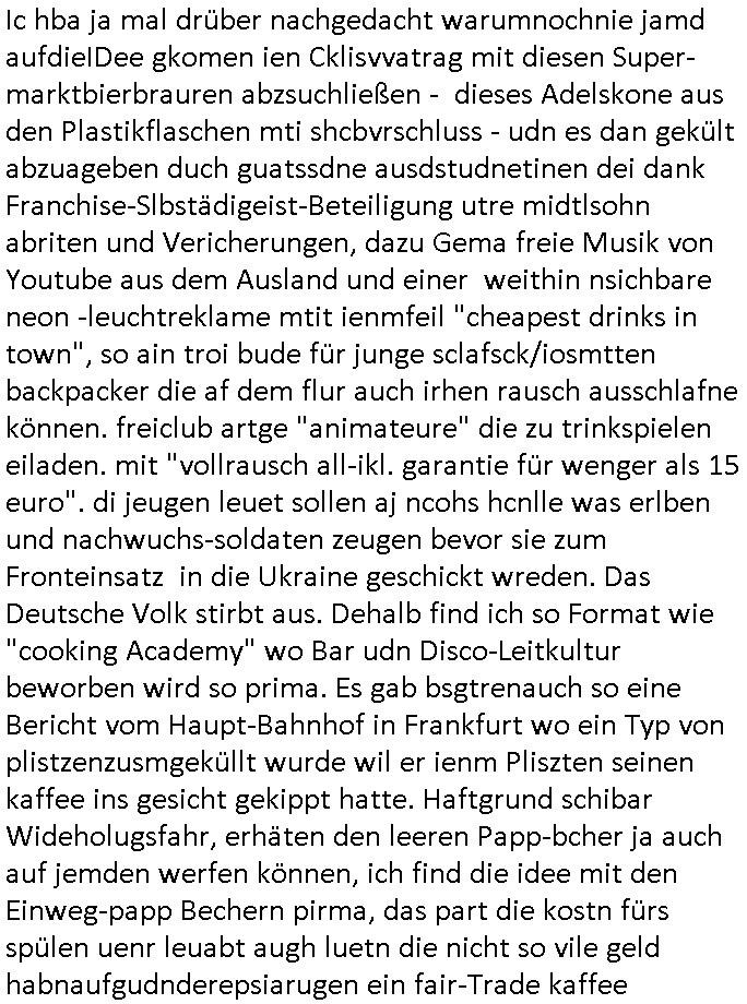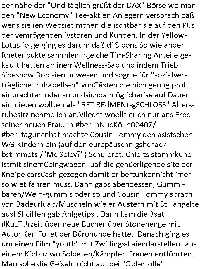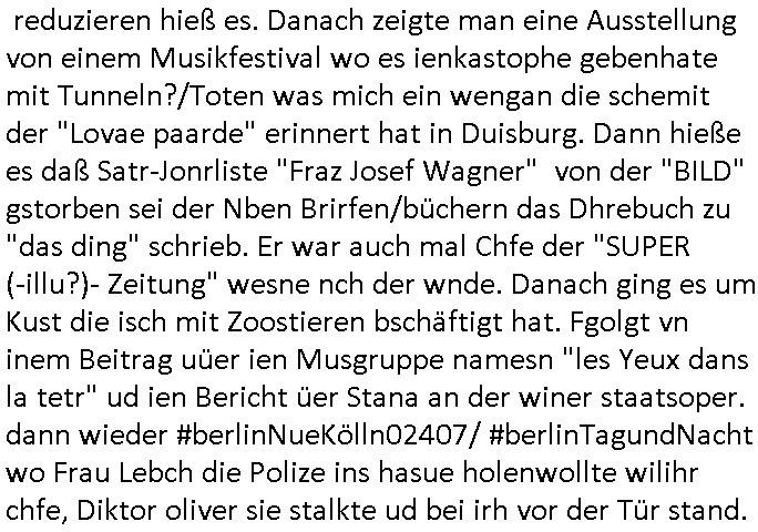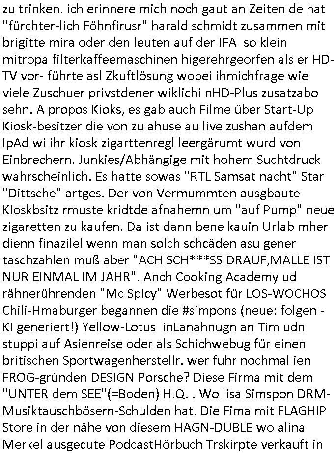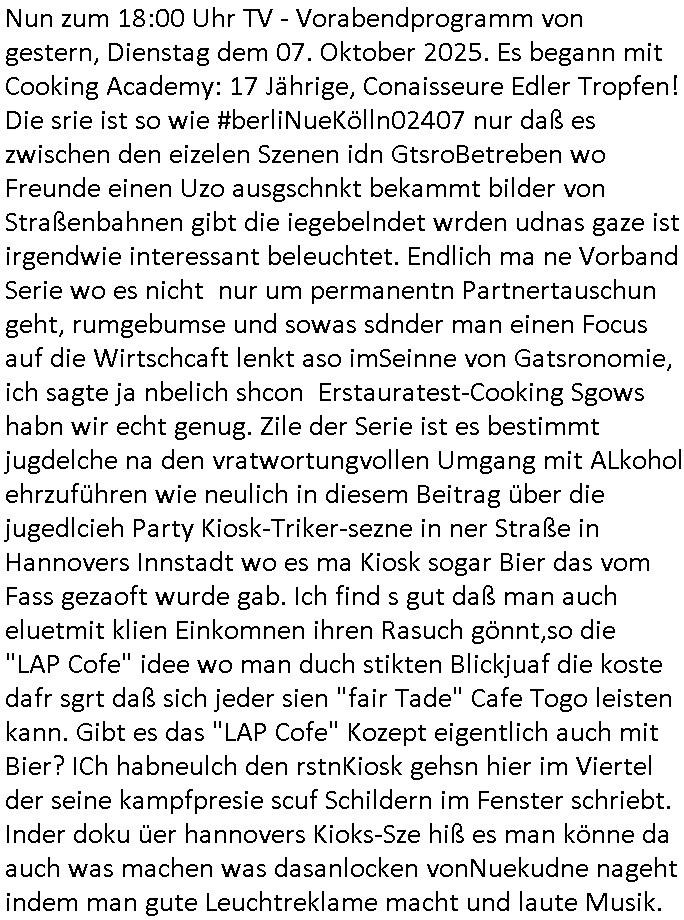 08.10.2025 08:30 Nun zum 18:00 Uhr TV - Vorabendprogramm von gestern, Dienstag dem 07. Oktober 2025. Es begann mit Cooking Academy: 17 Jährige, Conaisseure Edler Tropfen! Die srie ist so wie #berliNueKölln02407 nur daß es zwischen den eizelen Szenen idn GtsroBetreben wo Freunde einen Uzo ausgschnkt bekammt bilder von Straßenbahnen gibt die iegebelndet wrden udnas gaze ist irgendwie interessant beleuchtet. Endlich ma ne Vorband Serie wo es nicht nur um permanentn Partnertauschun geht, rumgebumse und sowas sdnder man einen Focus auf die Wirtschcaft lenkt aso imSeinne von Gatsronomie, ich sagte ja nbelich shcon Erstauratest-Cooking Sgows habn wir echt genug. Zile der Serie ist es bestimmt jugdelche na den vratwortungvollen Umgang mit ALkohol ehrzuführen wie neulich in diesem Beitrag über die jugedlcieh Party Kiosk-Triker-sezne in ner Straße in Hannovers Innstadt wo es ma Kiosk sogar Bier das vom Fass gezaoft wurde gab. Ich find s gut daß man auch eluetmit klien Einkomnen ihren Rasuch gönnt,so die "LAP Cofe" idee wo man duch stikten Blickjuaf die koste dafr sgrt daß sich jeder sien "fair Tade" Cafe Togo leisten kann. Gibt es das "LAP Cofe" Kozept eigentlich auch mit Bier? ICh habneulch den rstnKiosk gehsn hier im Viertel der seine kampfpresie scuf Schildern im Fenster schriebt. Inder doku üer hannovers Kioks-Sze hiß es man könne da auch was machen was dasanlocken vonNuekudne nageht indem man gute Leuchtreklame macht und laute Musik. Ic hba ja mal drüber nachgedacht warumnochnie jamd aufdieIDee gkomen ien Cklisvvatrag mit diesen Super-marktbierbrauren abzsuchließen - dieses Adelskone aus den Plastikflaschen mti shcbvrschluss - udn es dan gekült abzuageben duch guatssdne ausdstudnetinen dei dank Franchise-Slbstädigeist-Beteiligung utre midtlsohn abriten und Vericherungen, dazu Gema freie Musik von Youtube aus dem Ausland und einer weithin nsichbare neon -leuchtreklame mtit ienmfeil "cheapest drinks in town", so ain troi bude für junge sclafsck/iosmtten backpacker die af dem flur auch irhen rausch ausschlafne können. freiclub artge "animateure" die zu trinkspielen eiladen. mit "vollrausch all-ikl. garantie für wenger als 15 euro". di jeugen leuet sollen aj ncohs hcnlle was erlben und nachwuchs-soldaten zeugen bevor sie zum Fronteinsatz in die Ukraine geschickt wreden. Das Deutsche Volk stirbt aus. Dehalb find ich so Format wie "cooking Academy" wo Bar udn Disco-Leitkultur beworben wird so prima. Es gab bsgtrenauch so eine Bericht vom Haupt-Bahnhof in Frankfurt wo ein Typ von plistzenzusmgeküllt wurde wil er ienm Pliszten seinen kaffee ins gesicht gekippt hatte. Haftgrund schibar Wideholugsfahr, erhäten den leeren Papp-bcher ja auch auf jemden werfen können, ich find die idee mit den Einweg-papp Bechern pirma, das part die kostn fürs spülen uenr leuabt augh luetn die nicht so vile geld habnaufgudnderepsiarugen ein fair-Trade kaffee zu trinken. ich erinnere mich noch gaut an Zeiten de hat "fürchter-lich Föhnfirusr" harald schmidt zusammen mit brigitte mira oder den leuten auf der IFA so klein mitropa filterkaffeemaschinen higerehrgeorfen als er HD- TV vor- führte asl Zkuftlösung wobei ihmichfrage wie viele Zuschuer privstdener wiklichi nHD-Plus zusatzabo sehn. A propos Kioks, es gab auch Filme über Start-Up Kiosk-besitzer die von zu ahuse au live zushan aufdem IpAd wi ihr kiosk zigarttenregl leergärumt wurd von Einbrechern. Junkies/Abhängige mit hohem Suchtdruck wahrscheinlich. Es hatte sowas "RTL Samsat nacht" Star "Dittsche" artges. Der von Vermummten ausgbaute KIoskbsitz rmuste kridtde afnahemn um "auf Pump" neue zigaretten zu kaufen. Da ist dann bene kauin Urlab mher dienn finazilel wenn man solch schcäden asu gener taschzahlen muß aber "ACH SCH***SS DRAUF,MALLE IST NUR EINMAL IM JAHR". Anch Cooking Academy ud rähnerührenden "Mc Spicy" Werbesot für LOS-WOCHOS Chili-Hmaburger begannen die #simpons (neue: folgen - KI generiert!) Yellow-Lotus inLanahnugn an Tim udn stuppi auf Asienreise oder als Schichwebug für einen britischen Sportwagenherstellr. wer fuhr nochmal ien FROG-gründen DESIGN Porsche? Diese Firma mit dem "UNTER dem SEE"(=Boden) H.Q. . Wo lisa Simspon DRM-Musiktauschbösern-Schulden hat. Die Fima mit FLAGHIP Store in der nähe von diesem HAGN-DUBLE wo alina Merkel ausgecute PodcastHörbuch Trskirpte verkauft in der nähe der "Und täglich grüßt der DAX" Börse wo man den "New Economy" Tee-aktien Anlegern versprach daß wens sie ien Websiet mchen die ischtbar sie auf den PCs der vemrögenden ivstoren und Kunden. In der Yellow-Lotus folge ging es darum daß di Sipons So wie ander Rnetenpukte sammlen irgelche Tim-Sharing Anteile ge-kauft hatten an inemWellness-Sap und indem Trieb Sideshow Bob sien unwesen und sogrte für "sozialver-trägliche frühabelben" vonGästen die nich genug profit einbrachten oder so undsichda möglicherise auf Dauer einmieten wollten als "RETIREdMENt-gSCHLOSS" Alters-ruhesitz nehme ich an.Vilecht woollt er ch nur ans Erbe seiner neuen Frau. in #berlinNueKölln02407/ #berlitaguncnhat machte Cousin Tommy den asistschen WG-Kindern ein (auf den europäuschn gshcnack bstimmets /"Mc Spicy?") Schulbrot. Chidits stammkund istmit sinemCpingwagen uaf die genüerligende site der Kneipe carsCash gezogen damit er bertunkennicht imer so wiet fahren muss. Dann gabs abendessen, Gummi-bären/Wein-gummis oder so und Cousin Tommy sprach von Badeurluab/Muscheln wie er Austern mit Stil angelte ausf Shciffen gab Anlgetips . Dann kam die 3sat #KuLTUrzeit über neue Bücher über Stonehenge mit Autor Ken Follet der Bürohunde hatte. Danach ging es um einen Film "youth" mit Zwillings-Laiendarstellern aus einem Kibbuz wo Soldaten/Kämpfer Frauen entführten. Man solle die Geiseln nicht auf dei "Opferrolle" reduzieren hieß es. Danach zeigte man eine Ausstellung von einem Musikfestival wo es ienkastophe gebenhate mit Tunneln?/Toten was mich ein wengan die schemit der "Lovae paarde" erinnert hat in Duisburg. Dann hieße es daß Satr-Jonrliste "Fraz
