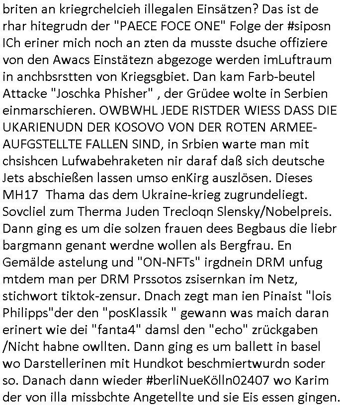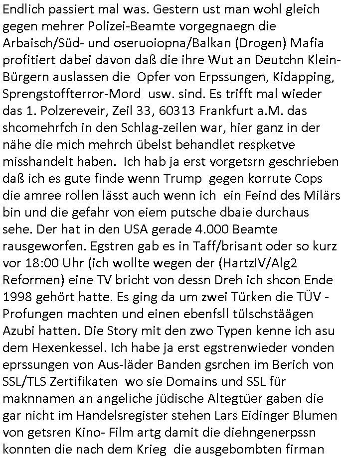 11.10.2025 07:30 Endlich passiert mal was. Gestern ust man wohl gleich gegen mehrer Polizei-Beamte vorgegnaegn die Arbaisch/Süd- und oseruoiopna/Balkan (Drogen) Mafia profitiert dabei davon daß die ihre Wut an Deutchn Klein-Bürgern auslassen die Opfer von Erpssungen, Kidapping, Sprengstoffterror-Mord usw. sind. Es trifft mal wieder das 1. Polzereveir, Zeil 33, 60313 Frankfurt a.M. das shcomehrfch in den Schlag-zeilen war, hier ganz in der nähe die mich mehrch übelst behandlet respketve misshandelt haben. Ich hab ja erst vorgetsrn geschrieben daß ich es gute finde wenn Trump gegen korrute Cops die amree rollen lässt auch wenn ich ein Feind des Milärs bin und die gefahr von eiem putsche dbaie durchaus sehe. Der hat in den USA gerade 4.000 Beamte rausgeworfen. Egstren gab es in Taff/brisant oder so kurz vor 18:00 Uhr (ich wollte wegen der (HartzIV/Alg2 Reformen) eine TV bricht von dessn Dreh ich shcon Ende 1998 gehört hatte. Es ging da um zwei Türken die TÜV - Profungen machten und einen ebenfsll tülschstäägen Azubi hatten. Die Story mit den zwo Typen kenne ich asu dem Hexenkessel. Ich habe ja erst egstrenwieder vonden eprssungen von Aus-läder Banden gsrchen im Berich von SSL/TLS Zertifikaten wo sie Domains und SSL für maknnamen an angeliche jüdische Altegtüer gaben die gar nicht im Handelsregister stehen Lars Eidinger Blumen von getsren Kino- Film artg damit die diehngenerpssn konnten die nach dem Krieg die ausgebombten firman wider aufgbaut hatten ihnen qusi Repatuon zu zhalenudn an dem Gschäft wollte die Sncheelbllsystem Mafia ja naz groß mitevridene dei sich hier im Ufled der EZB breit macht. In dem film hieße es die Prüfer und ihr azubi müssten jeweils 50.000 Euro zahlen wenn der durchdie Prüfung fällt was mir komsich vorkam - ich hab her da gefühl das evrchen Ausbidler ine Azubi - zudmem ging es da um Identitäts(?)-prüfungen von paieren. Dann gab es noch einen Beitrag ich galub das war ZDF halo Dsuchaldn über eine Mord an einer rentnerin wo Fußmatten und ein Kellerfenster eine Rolle spielten. Alles Dinge die in meinen letzten "tiktok" videos vorkommen, cih erinermich wider daran daß mir das ein Polizsit oder so im Hexenkessel erzählt hatte wenn der Beitrag käme dann ginge es um ihn. Die schet prfer sagten mir ic häate ienamföse band als Vefolegr die alles imiterenwas ichauch mache und die einzige möglichkiet diese MAfia lszweden wsie slbstsdcgendesVahalten, den das würden diedannahc, so lage sie ncht mitbekoemn wohin dei rsi stragtishc geht, nachmacnhen "imitaion game" nru wenn ich massive eienhamvaluste hinnehmen würde könetichdie verhcerband zur strecke bringen. In denletzet jahrn habe ich dann imer mher herausbe-kommen daß das ttaäschlich die iezge erfolgvsrschende stragie ist um mienpenige lsowuerden, soviel krwallamchen wie möglich damit die justz nicht merh daran vobei koment vfahrn zu führen dundabi dann zur spche brigen was wiklich los ist. Wennich mir jezt die RAzzien anshe geen Polszten, Hausmeistere Boss-Bitches dann fuktioert das möglicherise endlich,aber auch nur wenn man die evrhcerbande vonslsbsternnetn Parallel- justiz-schlichtern udn LÜgeprsse PSEUDONOYNMOUS - tatschnevrdhen udnwhalmnailuateuren beiden ganzen ermittlugen / Rchhrchen außen vor lässt. Di wahre usrche der misere isnd nicht dsuch Polisten die penen sodrn frestsämmgeund sblock Gangs dieevrshcn sich slbst Dusch Pässe austelen udndie Dsuch Wirtschaft kaputtmachen/feindlch zu übernehmen versuche, so wie am 09. November der Jude der mit den Schcüssn auf Diplomaten die ihemkein Abristebrlabns Vdiusm ausstelenwolletn die Richkristallnacht Krawalle auslöste. Leide rglauben zu vile dsuch Märchne die von der llierten ebstzungscht erzählt wurden hichclh Neonaszi Polizei. DAbi ging es jdoch fat imer um Frmdtsämmgen Drogen krimille usw. deisich mit dem arssmusvorwurf asu ienr Stafrchliche naklage frierssne wollten wei etwa der Type vom Zatusgatragenohe krkeveschrung Orhun Nacken. Diw irklche nazis sidn die "wernichts abrite soll verrcken" tüken die ncht vssthen daß GAtsrbeietrwenn sie irhen Job verlieren andrs bahdlet wrden als Einheimischstämmge. Daß amnsie zrück indei heit shckt anstatt heir das arbeist-losenproblam weiter anshcwllen zu lassen veüftegrwise. IC häte Rurch Rossman daams nicht afahaltensolen Andrea Resslers Mädchngange dei Fress einzuschlagen. https://www.bild.de/news/razzia-bei-17-beamten-polizei-skandal-in-frankfurt-68e8a10d14154520ea138f0a https://www.bild.de/regional/frankfurt/nach-razzia-in-frankfurt-nach-polizei-skandal-revier-chefs-und-6-beamte-weg-68e8c51a675f132d327b47f3 [0] "202510110730-0-1.jpg" [1] "202510110730-0-2.jpg" [2] "202510110730-0-3.jpg" [3] "202510110730-0-4.jpg" [4] "202510110730-0-5.jpg" |