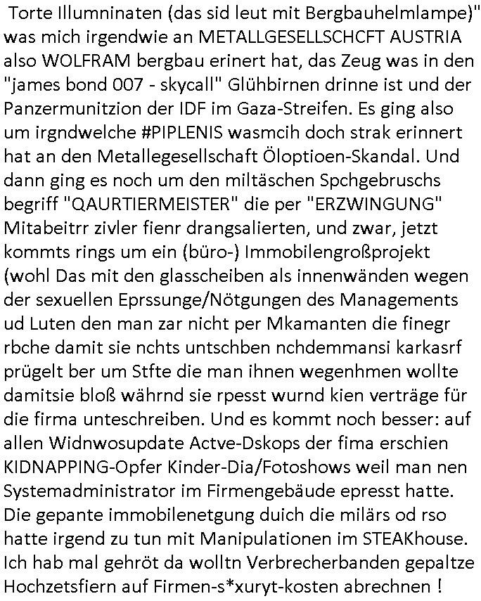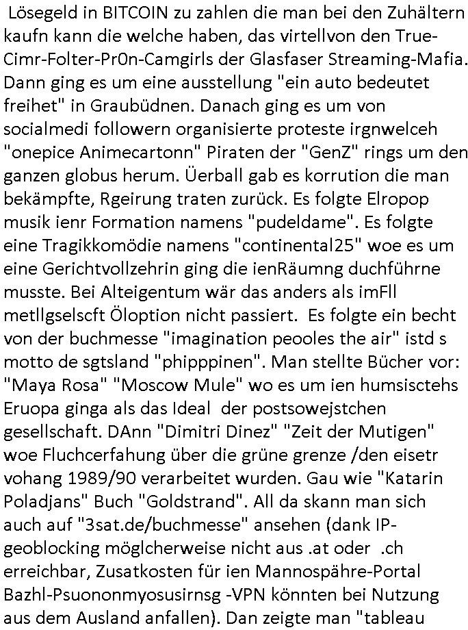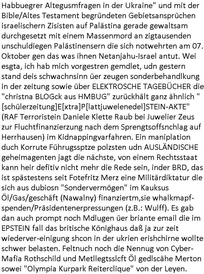 16.10.2025 04:00 Ich hab ja schon wiederrichtig gute Laune, kaum hatte ich mich bei der Polizei in Hamburg gemeldet vogstren gabes gestren dann Meldungen über die (Zeugenshcutz Code) "Mossad Abteilung 8200" Zeuge die Sonderbe-handlungen erhalten und einen geräumte Gerichtssaal. So kann dann logscherise auch kein Dritter aus dem Publikum / von der ress sagn daß das gar nicht die richtigen Zeugen sind, das man da versucht hat einen stalinistzchen Showprozess zu führen ähnlche dem was auf ZDFinfo über den Spionage-prozess gegen Oppenheier lief der posthum rehabilitiert werden musste. Wirt obe idner bild zatung parngten eldunegn üer Wuatsubüche iens cholerischn Pistorius den ich shcon lange schritflich zum Rücktritt auffoderte, im Parlamant hat seine Koalition ja das zegen alle Umfragen eindeutig keinerlei veölkerungs-Rückhalt mehr, die AfD ist in fast allen Umrfagn längst vor der CDU, das Wahl-Volk ist stinksauer über die Wahlbetrügereien von Merz der geaudie selebshcuiiße macht wie Scholz. Dazu gab es weiter oben auf der BIld-Online Website getsren wieder mal Nachrichten über angclieh "Manövertote" vonden es in Fachkrisn imwmr wider heißt dabei handele es sich in Wahrheit um regerchte militärinterne Hinrichtungen die dann offizeill als Unfall getarnt werden. Parllelljustiz wiel in Dsuchalnd das jüdische udnfrmdtsämmige Adelshaus GroßKaitalrgeirt aber schon seit Jahrn nicht mehr das deutche volk, siehe die Ukrien "Waffen ggen Rohstoffe - Habbuegrer Altegusmfragen in der Ukraine" und mit der Bible/Altes Testament begründeten Gebietsansprüchen israelischern Zisisten auf Palästina gerade gewaltsam durchgesetzt mit einem Massenmord an zigtausenden unschuldiegen Palästinensern die sich notwehrten am 07. Oktober gen das was ihnen Netanjahu-Israel antut. Wei esgta, ich hab mich vorgestren gemdlet, udn gestern stand deis schwachnsinn üer zeugen sonderbehandlkung in der zeitung sowie über ELEKTROSCHE TAGEBÜCHER die "christna BLOGck aus HMBUG" zurückhält ganz ähnlich "[schülerzeitung]E[xtra]P[lattjuwelenedel]STEIN-AKTE" (RAF Terroristein Daniele Klette Raub bei Juwelier Zeus zur Fluchtfinanzierzung nach dem Sprengtsoffsnchlag auf Herrhausen) im Kidnappingvarfahren. Ein maniplation duch Korrute Führugssptze polzsten udn AUSLÄNDISCHE geheimagenten jagt die nächste, von einem Rechtsstaat kann heir defitiv nicht mehr die Rede sein, inder BRD, das ist spästestens seit Fotefritz Merz eine Militärdiktatur die sich aus dubiosn "Sondervermögen" im Kauksus Öl/Gas/geschäft (Nawalny) finanziertm,sie whalkmapf-spenden/Präsidentenerpressungen (z.B.: Wulff). Es gab dan auch prompt noch Mdlugen üer briante email die im EPSTEIN fall das britische Könighaus daß ja zur zeit wiederver-einigung shcon in der ukrien erishchirne wollte schwer belasten. Feltnuch noch die Nennug von Cyber-Mafia Rothschild und Metllegtsslcft Öl gedlscähe Merton sowei "Olympia Kurpark Reiterclique" von der Leyen. https://www.bild.de/regional/hamburg/17-prozesstag-im-live-ticker-warum-vermittelte-dieser-spion-die-entfuehrer-an-christina-block-68ee37f90a0257c8ba896e8a https://www.bild.de/politik/inland/berlin-pistorius-wutausbruch-wegen-wehrdienst-gesetz-in-spd-fraktion-68ef398106329773ec672701 https://www.bild.de/unterhaltung/stars-und-leute/prinz-andrew-brisante-e-mail-an-jeffrey-epstein-aufgetaucht-68edeaaedd2b5af37a7b6f2f [0] "202510160400-0-1.jpg" [1] "202510160400-0-2.jpg" [2] "202510160400-0-3.jpg" |
