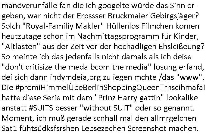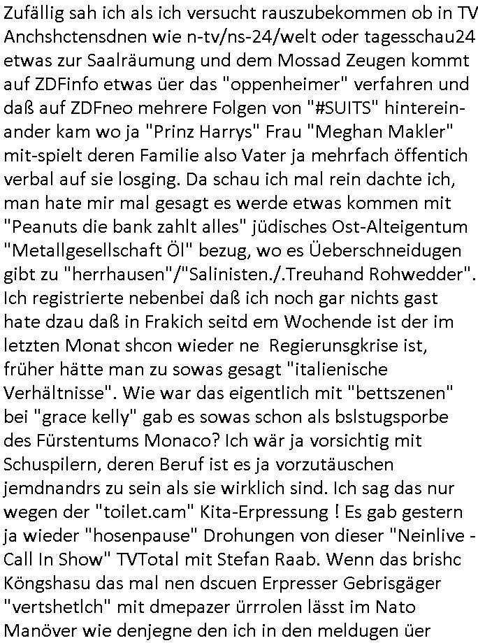 16.10.2025 04:01 Zufällig sah ich als ich versucht rauszubekommen ob in TV Anchshctensdnen wie n-tv/ns-24/welt oder tagesschau24 etwas zur Saalräumung und dem Mossad Zeugen kommt auf ZDFinfo etwas üer das "oppenheimer" verfahren und daß auf ZDFneo mehrere Folgen von "#SUITS" hinterein-ander kam wo ja "Prinz Harrys" Frau "Meghan Makler" mit-spielt deren Familie also Vater ja mehrfach öffentich verbal auf sie losging. Da schau ich mal rein dachte ich, man hate mir mal gesagt es werde etwas kommen mit "Peanuts die bank zahlt alles" jüdisches Ost-Alteigentum "Metallgesellschaft Öl" bezug, wo es Üeberschneidugen gibt zu "herrhausen"/"Salinisten./.Treuhand Rohwedder". Ich registrierte nebenbei daß ich noch gar nichts gast hate dzau daß in Frakich seitd em Wochende ist der im letzten Monat shcon wieder ne Regierunsgkrise ist, früher hätte man zu sowas gesagt "italienische Verhältnisse". Wie war das eigentlich mit "bettszenen" bei "grace kelly" gab es sowas schon als bslstugsporbe des Fürstentums Monaco? Ich wär ja vorsichtig mit Schuspilern, deren Beruf ist es ja vorzutäuschen jemdnandrs zu sein als sie wirklich sind. Ich sag das nur wegen der "toilet.cam" Kita-Erpressung ! Es gab gestern ja wieder "hosenpause" Drohungen von dieser "Neinlive - Call In Show" TVTotal mit Stefan Raab. Wenn das brishc Köngshasu das mal nen dscuen Erpresser Gebrisgäger "vertshetlch" mit dmepazer ürrrolen lässt im Nato Manöver wie denjegne den ich in den meldugen üer manöverunfälle fan die ich googelte würde das Sinn er-geben, war nicht der Erpssser Bruckmaier Gebirgsjäger? Solch "Royal-Familiy Makler" Hüllenlos Filmchen komen heutzutage schon im Nachmittagsprogramm für Kinder, "Altlasten" aus der Zeit vor der hochadligen Ehslcißeung? So meinte ich das jedenfalls nicht damals als ich deise "don't critisize the meda bcom the media" losung erfand dei sich dann indymdeia,prg zu iegen mchte /das "www". Die #promiHimmelÜbeBerlinShoppingQueenTrhscihmafai hatte diese Serie mit dem "Prinz Harry gattin" lookalike anstatt #SUITS besser "without SUIT" oder so genannt. Moment, ich muß gerade scnhall mal den allmrgelchen Sat1 fühtsüdksfsrshen Lebsezechen Screenshot machen. https://www.bild.de/politik/ausland/politik-ausland/bundeswehr-soldat-stirbt-bei-nato-manoever-in-norwegen-58347894.bild.html https://tvinfo.de/fernsehprogramm/2221731681-die-stefan-raab-show https://tvinfo.de/fernsehprogramm/2226184459-tv-total-interaktiv [0] "202510160401-0-1.jpg" [1] "202510160401-0-2.jpg" [2] "202510160401-0-3.jpg" |