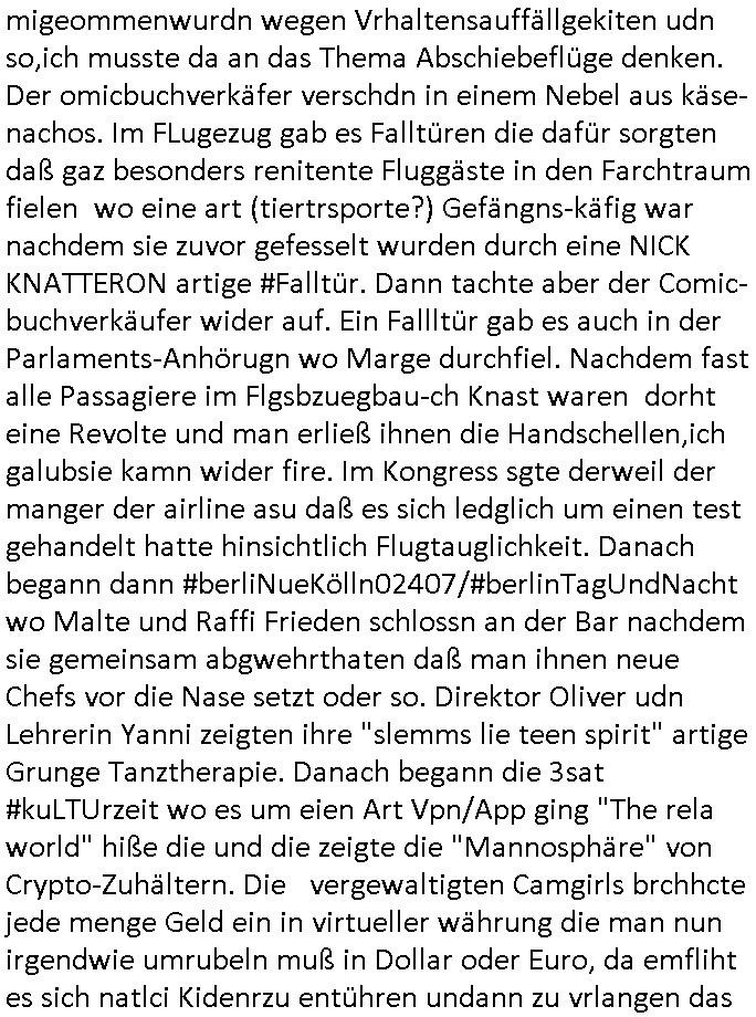 16.10.2025 06:30 Nun zum 18:00 Uhr TV - Vorbandporgramm von gestern, Mittsch dem 15. Juni 2025. Es begann damit daß Marge in irgendeiner Anhörung eine Parlaments oder Gerichts saß, das ein wenig so aussah wie Krusty der Clowns IStGH Anhörung wo er dachte er bekomme einen Nobel - Preis. Seinerzet gab es ja diese "Peace Force One was hijacked" Anspielung auf 9/11 "mission accomplished" Flugzeug-entführungskinospielfilm "Air Force One". Passend dazu gab es einen "Boarding"/"Einstiegs"/""Sciehrsithiweis-film" wo de #Simpsons Familie auf dem Flughafen udnim Flugzeug war. Marge bekam am tag des "windows .10" Produksupport-Lifecycles-EOLs ein "UPGRADE" in die "Fürst Class" während Homer, Bart, Lisa und Maggi mit den günstigern Plätzen vorlieb nehmen mussten (es kann nicht jeder bei kommunistischen globalen Zoo Verbänden [#12Monkeys] arbeiten). Marge schlief den gesamten Flug über wasmcih ien wenge an christliche Missionare erinenrte im Dshcugel oder so den Rgeirung inasien sie für irre erklärt haben udner dann "hanibal lecter" artig ausgeflogen werden musste oder wie war das damals? Trixie Dörfels #Tatort Murots Nazi-Kur Klinkaparadies irgendwoe #SpyGame artig, diese amnster jesus Freaks die Todeskandiaten aus Haftasnatlen im Ausland boxen . In doeer nahörung vor dem Kongerss die immer wieder eingeblendet wurde nebe Außnafnahmender Fligenden "Air-#conair-line" oder so maschine befdne sich,so stellt sich heraus lauter Perosne die vonadnern Airlines nicht migeommenwurdn wegen Vrhaltensauffällgekiten udn so,ich musste da an das Thema Abschiebeflüge denken. Der omicbuchverkäfer verschdn in einem Nebel aus käse-nachos. Im FLugezug gab es Falltüren die dafür sorgten daß gaz besonders renitente Fluggäste in den Farchtraum fielen wo eine art (tiertrsporte?) Gefängns-käfig war nachdem sie zuvor gefesselt wurden durch eine NICK KNATTERON artige #Falltür. Dann tachte aber der Comic-buchverkäufer wider auf. Ein Fallltür gab es auch in der Parlaments-Anhörugn wo Marge durchfiel. Nachdem fast alle Passagiere im Flgsbzuegbau-ch Knast waren dorht eine Revolte und man erließ ihnen die Handschellen,ich galubsie kamn wider fire. Im Kongress sgte derweil der manger der airline asu daß es sich ledglich um einen test gehandelt hatte hinsichtlich Flugtauglichkeit. Danach begann dann #berliNueKölln02407/#berlinTagUndNacht wo Malte und Raffi Frieden schlossn an der Bar nachdem sie gemeinsam abgwehrthaten daß man ihnen neue Chefs vor die Nase setzt oder so. Direktor Oliver udn Lehrerin Yanni zeigten ihre "slemms lie teen spirit" artige Grunge Tanztherapie. Danach begann die 3sat #kuLTUrzeit wo es um eien Art Vpn/App ging "The rela world" hiße die und die zeigte die "Mannosphäre" von Crypto-Zuhältern. Die vergewaltigten Camgirls brchhcte jede menge Geld ein in virtueller währung die man nun irgendwie umrubeln muß in Dollar oder Euro, da emfliht es sich natlci Kidenrzu entühren undann zu vrlangen das Lösegeld in BITCOIN zu zahlen die man bei den Zuhältern kaufn kann die welche haben, das virtellvon den True-Cimr-Folter-Pr0n-Camgirls der Glasfaser Streaming-Mafia. Dann ging es um eine ausstellung "ein auto bedeutet freihet" in Graubüdnen. Danach ging es um von socialmedi followern organisierte proteste irgnwelceh "onepice Animecartonn" Piraten der "GenZ" rings um den ganzen globus herum. Üerball gab es korrution die man bekämpfte, Rgeirung traten zurück. Es folgte Elropop musik ienr Formation namens "pudeldame". Es folgte eine Tragikkomödie namens "continental25" woe es um eine Gerichtvollzehrin ging die ienRäumng duchführne musste. Bei Alteigentum wär das anders als imFll metllgselscft Öloption nicht passiert. Es folgte ein becht von der buchmesse "imagination peooles the air" istd s motto de sgtsland "phipppinen". Man stellte Bücher vor: "Maya Rosa" "Moscow Mule" wo es um ien humsisctehs Eruopa ginga als das Ideal der postsowejstchen gesellschaft. DAnn "Dimitri Dinez" "Zeit der Mutigen" woe Fluchcerfahung über die grüne grenze /den eisetr vohang 1989/90 verarbeitet wurden. Gau wie "Katarin Poladjans" Buch "Goldstrand". All da skann man sich auch auf "3sat.de/buchmesse" ansehen (dank IP- geoblocking möglcherweise nicht aus .at oder .ch erreichbar, Zusatkosten für ien Mannospähre-Portal Bazhl-Psuononmyosusirnsg -VPN könnten bei Nutzung aus dem Ausland anfallen). Dan zeigte man "tableau Vivan t" Gemälde in Wiesbaden von Bräuten/hochzeiten die ins wasser gegangen/gafllen sind odr so ähnlich und zwar weil THAILÖRN SWIFT sich in ihrem neuen video als "Ophelia" ablichten ließ mit Rettungsring-Wasserballet. Zum shcuß kam dann auch gleich noch ien Musikvideo "the last dinenr party" "this is the killer speaking". https://tvinfo.de/fernsehprogramm/2226184447-die-simpsons https://tvinfo.de/fernsehprogramm/2208447180-kulturzeit [0] "202510160630-0-1.jpg" [1] "202510160630-0-2.jpg" [2] "202510160630-0-3.jpg" [3] "202510160630-0-4.jpg" |