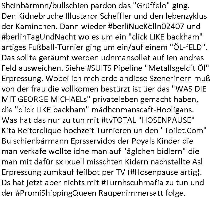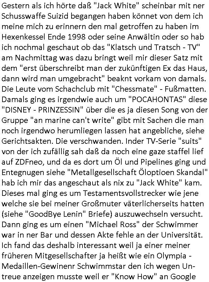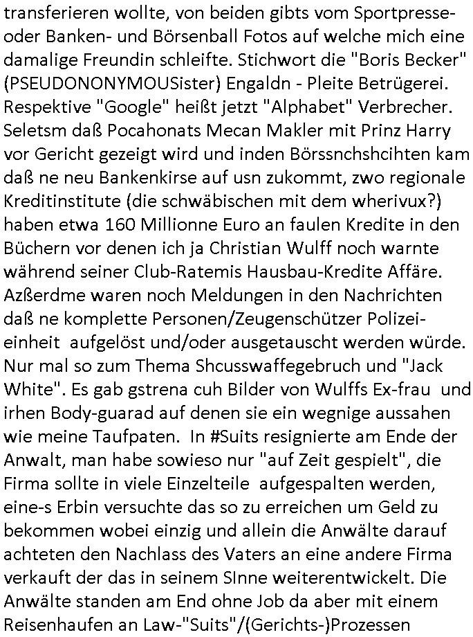 18.10.2025 07:00 Gestern als ich hörte daß "Jack White" scheinbar mit ner Schusswaffe Suizid begangen haben könnet von dem ich meine mich zu erinnern den mal getroffen zu haben im Hexenkessel Ende 1998 oder seine Anwältin oder so hab ich nochmal geschaut ob das "Klatsch und Tratsch - TV" am Nachmittag was dazu bringt weil mir dieser Satz mit dem "erst überschreibt man der zukünftigen Ex das Haus, dann wird man umgebracht" beaknt vorkam von damals. Die Leute vom Schachclub mit "Chessmate" - Fußmatten. Damals ging es irgendwie auch um "POCAHONTAS" diese "DISNEY - PRINZESSIN" über die es ja diesen Song von der Gruppe "an marine can't write" gibt mit Sachen die man noch irgendwo herumliegen lassen hat angebliche, siehe Gerichtsakten. Die verschwanden. Inder TV-Serie "suits" von der ich zufällig sah daß da noch eine gaze staffel lief auf ZDFneo, und da es dort um Öl und Pipelines ging und Entegnugen siehe "Metallgesellschaft Öloptioen Skandal" hab ich mir das angeschaut als nix zu "Jack White" kam. Dieses mal ging es um Testamentsvollstrecker wie jene welche sie bei meiner Großmuter väterlicherseits hatten (siehe "GoodBye Lenin" Briefe) auszuwechseln versucht. Dann ging es um einen "Michael Ross" der Schwimmer war in ner Bar und dessen Akte fehle an der Universität. Ich fand das deshalb interessant weil ja einer meiner früheren Mitgesellschafter ja heißt wie ein Olympia -Medaillen-Gewinenr Schwimmstar den ich wegen Un-treue anzeigen musste weil er "Know How" an Google transferieren wollte, von beiden gibts vom Sportpresse- oder Banken- und Börsenball Fotos auf welche mich eine damalige Freundin schleifte. Stichwort die "Boris Becker" (PSEUDONONYMOUSister) Engaldn - Pleite Betrügerei. Respektive "Google" heißt jetzt "Alphabet" Verbrecher. Seletsm daß Pocahonats Mecan Makler mit Prinz Harry vor Gericht gezeigt wird und inden Börssnchshcihten kam daß ne neu Bankenkirse auf usn zukommt, zwo regionale Kreditinstitute (die schwäbischen mit dem wherivux?) haben etwa 160 Millionne Euro an faulen Kredite in den Büchern vor denen ich ja Christian Wulff noch warnte während seiner Club-Ratemis Hausbau-Kredite Affäre. Azßerdme waren noch Meldungen in den Nachrichten daß ne komplette Personen/Zeugenschützer Polizei-einheit aufgelöst und/oder ausgetauscht werden würde. Nur mal so zum Thema Shcusswaffegebruch und "Jack White". Es gab gstrena cuh Bilder von Wulffs Ex-frau und irhen Body-guarad auf denen sie ein wegnige aussahen wie meine Taufpaten. In #Suits resignierte am Ende der Anwalt, man habe sowieso nur "auf Zeit gespielt", die Firma sollte in viele Einzelteile aufgespalten werden, eine-s Erbin versuchte das so zu erreichen um Geld zu bekommen wobei einzig und allein die Anwälte darauf achteten den Nachlass des Vaters an eine andere Firma verkauft der das in seinem SInne weiterentwickelt. Die Anwälte standen am End ohne Job da aber mit einem Reisenhaufen an Law-"Suits"/(Gerichts-)Prozessen wen ich das richtig verstanden habe ach weil ein anältin die Prinz Harrys Ehefrau spielte lieber nicht im Ausland studiern gehen wollte woeb i man wahrscheinlich ihre Stdienbidengt wnabsehiet dazu genutzt hätte innerhalb der Firma Mist zu bauen duch ihre Vertretung. Die ganz "Quartiermeister-Erzwingungs" Scheiße aus de rletzte "folge/staffel" wurde damait getopt das diesmal ienr der Partner sagte er führe generalstabsartig Schlachten. Ich wieß jazt aberime rnoc nicht so genau wieso ich bei "meghan Makler" der DISNEY PRINEZSSIN Ehefrau an ein tham aus eem blog hie rdneken muß, nämlich der wie die Nazis gesagt hätten fehlende Durchrassung zschen den Kolonialisten, Pilger-Zuwnderen und Plantagensklaven und der indianischen Ureinwohner in Nordamerika. Ich hab da mal was rausgesucht wo US-Unis berhcte haben wie ien Amerkanerin idealerweise ethno-genetsch aus-sehen müsse. As msichling aus idnsichne Fits-nation ur-einwhner wurzeln und zuwanderergenen so von wegen der Rassismusdebatte. Andes als Europ sind die USA ja eine Einwanderernation (gewesen - siehe etwa #Titanic). Und da musste ich asu irgeneinem an Pocahonats denken als ich "Meghan Makler" sah wenn sie leicht zur Seite gedreht steht und ihre Haare (Strähnen oder so?) von einem bestimmten Lichteufall getroffen werden. Und ich erinnere mich auch daß das was zu tun hatte mit vershcudnen Prozess-Akten Ende 1998 im Hexenkessel und Musik von dieser Band ("an marine can't write"). -- ich fürchte wir speilen was ist eine disney prizessin jeorpardy https://tvinfo.de/fernsehprogramm/2210449222-suits https://tvinfo.de/fernsehprogramm/2210449225-suits https://tvinfo.de/fernsehprogramm/2210449228-suits https://tvinfo.de/fernsehprogramm/2210449231-suits https://www.welt.de/kultur/article68f0bbe634e731de12f556c8/jack-white-stirbt-im-alter-von-85-jahren-polizei-bestaetigt-schussverletzungen.html https://www.manager-magazin.de/unternehmen/banken/bank-aktien-tief-im-minus-betrugsfaelle-bei-us-regionalbanken-verunsichern-maerkte-a-5238eb92-c366-4ae4-bc7a-2b213f75f2b5 https://xn--kultrlich-t9a.de/5318-es-tut-mir-leid-pocahontas/ ( https://de.wikipedia.org/wiki/Punycode : "kultürlich.de" ) " Catchphrase „Es tut mir Leid…Pocahontas. " https://www.zeit.de/kultur/musik/2016-03/annenmaykantereit-generation-y-rockband " Ihr Sänger ... singt ... reibeisern ... und seine Texte sind genauso schlecht, nur auf Deutsch " ( also ich persölich finde es klimgt ein wenig nach nina hagens vergessnem farbfilm ) [0] "202510180700-0-1.jpg" [1] "202510180700-0-2.jpg" [2] "202510180700-0-3.jpg" [3] "202510180700-0-4.jpg" |