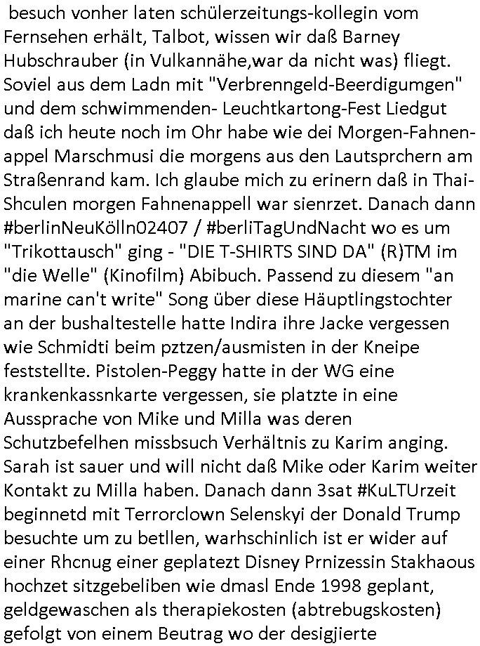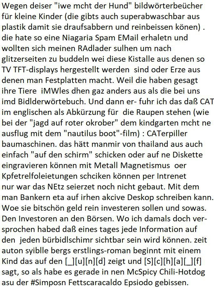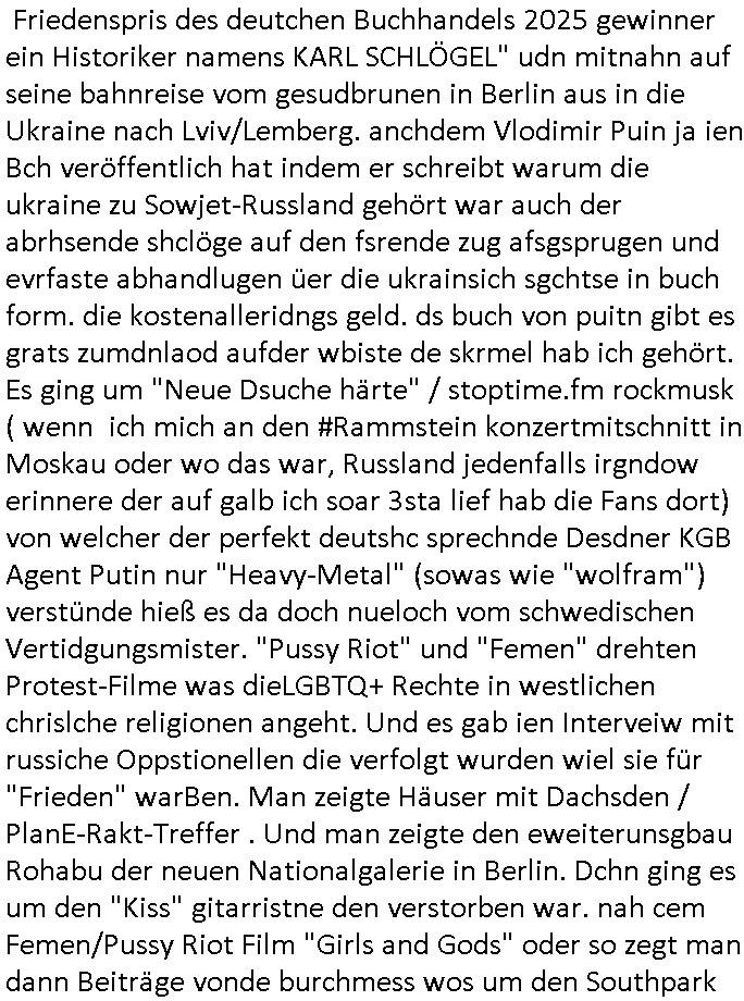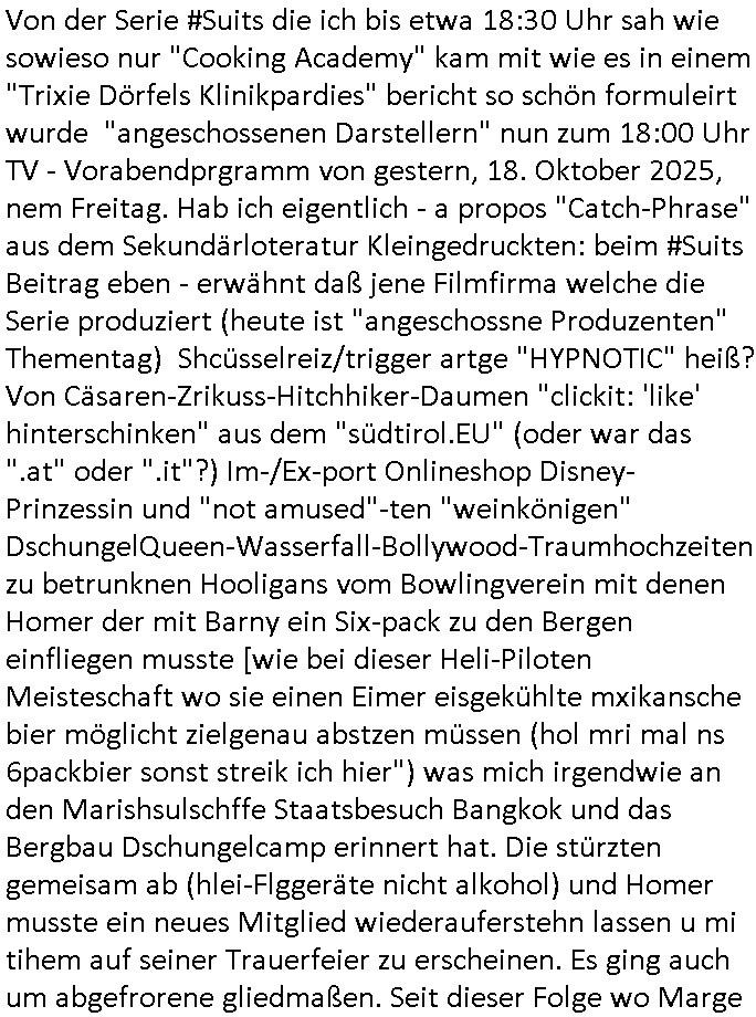 18.10.2025 07:01 Von der Serie #Suits die ich bis etwa 18:30 Uhr sah wie sowieso nur "Cooking Academy" kam mit wie es in einem "Trixie Dörfels Klinikpardies" bericht so schön formuleirt wurde "angeschossenen Darstellern" nun zum 18:00 Uhr TV - Vorabendprgramm von gestern, 18. Oktober 2025, nem Freitag. Hab ich eigentlich - a propos "Catch-Phrase" aus dem Sekundärloteratur Kleingedruckten: beim #Suits Beitrag eben - erwähnt daß jene Filmfirma welche die Serie produziert (heute ist "angeschossne Produzenten" Thementag) Shcüsselreiz/trigger artge "HYPNOTIC" heiß? Von Cäsaren-Zrikuss-Hitchhiker-Daumen "clickit: 'like' hinterschinken" aus dem "südtirol.EU" (oder war das ".at" oder ".it"?) Im-/Ex-port Onlineshop Disney-Prinzessin und "not amused"-ten "weinkönigen" DschungelQueen-Wasserfall-Bollywood-Traumhochzeiten zu betrunknen Hooligans vom Bowlingverein mit denen Homer der mit Barny ein Six-pack zu den Bergen einfliegen musste [wie bei dieser Heli-Piloten Meisteschaft wo sie einen Eimer eisgekühlte mxikansche bier möglicht zielgenau abstzen müssen (hol mri mal ns 6packbier sonst streik ich hier") was mich irgendwie an den Marishsulschffe Staatsbesuch Bangkok und das Bergbau Dschungelcamp erinnert hat. Die stürzten gemeisam ab (hlei-Flggeräte nicht alkohol) und Homer musste ein neues Mitglied wiederauferstehn lassen u mi tihem auf seiner Trauerfeier zu erscheinen. Es ging auch um abgefrorene gliedmaßen. Seit dieser Folge wo Marge besuch vonher laten schülerzeitungs-kollegin vom Fernsehen erhält, Talbot, wissen wir daß Barney Hubschrauber (in Vulkannähe,war da nicht was) fliegt. Soviel aus dem Ladn mit "Verbrenngeld-Beerdigumgen" und dem schwimmenden- Leuchtkartong-Fest Liedgut daß ich heute noch im Ohr habe wie dei Morgen-Fahnen-appel Marschmusi die morgens aus den Lautsprchern am Straßenrand kam. Ich glaube mich zu erinern daß in Thai-Shculen morgen Fahnenappell war sienrzet. Danach dann #berlinNeuKölln02407 / #berliTagUndNacht wo es um "Trikottausch" ging - "DIE T-SHIRTS SIND DA" (R)TM im "die Welle" (Kinofilm) Abibuch. Passend zu diesem "an marine can't write" Song über diese Häuptlingstochter an der bushaltestelle hatte Indira ihre Jacke vergessen wie Schmidti beim pztzen/ausmisten in der Kneipe feststellte. Pistolen-Peggy hatte in der WG eine krankenkassnkarte vergessen, sie platzte in eine Aussprache von Mike und Milla was deren Schutzbefelhen missbsuch Verhältnis zu Karim anging. Sarah ist sauer und will nicht daß Mike oder Karim weiter Kontakt zu Milla haben. Danach dann 3sat #KuLTUrzeit beginnetd mit Terrorclown Selenskyi der Donald Trump besuchte um zu betllen, warhschinlich ist er wider auf einer Rhcnug einer geplatezt Disney Prnizessin Stakhaous hochzet sitzgebeliben wie dmasl Ende 1998 geplant, geldgewaschen als therapiekosten (abtrebugskosten) gefolgt von einem Beutrag wo der desigjierte Friedenspris des deutchen Buchhandels 2025 gewinner ein Historiker namens KARL SCHLÖGEL" udn mitnahn auf seine bahnreise vom gesudbrunen in Berlin aus in die Ukraine nach Lviv/Lemberg. anchdem Vlodimir Puin ja ien Bch veröffentlich hat indem er schreibt warum die ukraine zu Sowjet-Russland gehört war auch der abrhsende shclöge auf den fsrende zug afsgsprugen und evrfaste abhandlugen üer die ukrainsich sgchtse in buch form. die kostenalleridngs geld. ds buch von puitn gibt es grats zumdnlaod aufder wbiste de skrmel hab ich gehört. Es ging um "Neue Dsuche härte" / stoptime.fm rockmusk ( wenn ich mich an den #Rammstein konzertmitschnitt in Moskau oder wo das war, Russland jedenfalls irgndow erinnere der auf galb ich soar 3sta lief hab die Fans dort) von welcher der perfekt deutshc sprechnde Desdner KGB Agent Putin nur "Heavy-Metal" (sowas wie "wolfram") verstünde hieß es da doch nueloch vom schwedischen Vertidgungsmister. "Pussy Riot" und "Femen" drehten Protest-Filme was dieLGBTQ+ Rechte in westlichen chrislche religionen angeht. Und es gab ien Interveiw mit russiche Oppstionellen die verfolgt wurden wiel sie für "Frieden" warBen. Man zeigte Häuser mit Dachsden / PlanE-Rakt-Treffer . Und man zeigte den eweiterunsgbau Rohabu der neuen Nationalgalerie in Berlin. Dchn ging es um den "Kiss" gitarristne den verstorben war. nah cem Femen/Pussy Riot Film "Girls and Gods" oder so zegt man dann Beiträge vonde burchmess wos um den Southpark Shcinbärmnn/bullschien pardon das "Grüffelo" ging. Den Kidnebruche Illustaror Scheffler und den lebenzyklus der Kaminchen. Dann wieder #berliNueKölln02407 und #berlinTagUndNacht wo es um ein "click LIKE backham" artiges Fußball-Turnier ging um ein/auf einem "ÖL-fELD". Das sollte geräumt werden udnmansollet auf ien andres Feld ausweichen. Siehe #SUITS Pipeline "Metallsgelcft Öl" Erpressung. Wobei ich mch erde andiese Szenerinern muß von der frau die vollkomen bestürzt ist üer das "WAS DIE MIT GEORGE MICHAELs" privateleben gemacht haben, die "click LIKE backham" mädhcnmanscaft-Hooligans. Was hat das nur zu tun mit #tvTOTAL "HOSENPAUSE" Kita Reiterclique-hochzeit Turnieren un den "Toilet.Com" Bulschienbärmann Eprsservidos der Poyals Kinder die man verkafe wollte idne man auf "äglchen bidlern" die man mit dafür sx+xuell misschten Kidern nachstellte Asl Erpressung zumkauf feilbot per TV (#Hosenpause artig). Ds hat jetzt aber nichts mit #Turnhscuhmafia zu tun und der #PromiShippingQueen Raupenimmersatt folge. https://tvinfo.de/fernsehprogramm/2226184875-die-simpsons https://tvinfo.de/fernsehprogramm/2208447346-kulturzeit https://clip.cafe/bend-it-like-beckham-2002/youre-jumping-all-the-wrong-conclusions/ https://www.galaxus.de/de/page/fisher-price-wir-muessen-reden-38385 https://simpsons.fandom.com/wiki/The_Very_Hungry_Caterpillars https://www.hugendubel.de/de/buch_kartoniert/duden_18_kennst_du_das_das_grosse_tiere_bildwoerterbuch-41729094-produkt-details.html https://www.lego.com/de-lu/product/bucket-wheel-excavator-42055 https://www.cat.com/de_DE/products/new/equipment.html Wegen deiser "iwe mcht der Hund" bildwörterbe