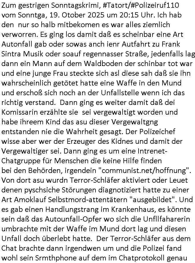 Zum gestrigen Sonntagskrimi, #Tatort/#Polizeiruf110 vom Sonntga, 19. Otober 2025 um 20:15 Uhr. Ich hab den nur so halb mitbekomen es war alles ziemlich verworren. Es ging los damit daß es scheinbar eine Art Autonfall gab oder sowas anch ienr Autfahrt zu Frank Sintra Musik oder soauf regennasser Straße, jedenfalls lag dann ein Mann auf dem Waldboden der schinbar tot war und eine junge Frau steckte sich asl diese sah daß sie ihn wahrscheinlich getötet hatte eine Waffe in den Mund und erschoß sich noch an der Unfallstelle wenn ich das richtig verstand. Dann ging es weiter damit daß dei Komissarin erzählte sie sei vergewaltigt worden und habe ihreem Kind das asu dieser Vergewaltgng entstanden nie die Wahrheit gesagt. Der Polizeichef wisse aber wer der Erzeuger des Kidnes und damit der Vergewaltiger sei. Dann ging es um eine Intrenet- Chatgruppe für Menschen die keine Hilfe finden bei den Behörden, irgendein "communist.net/hoffnung". Von dort asu wurdn Terror-Schläfer aktiviert oder Leuet denen pyschsiche Störungen diagnotiziert hatte zu einer Art Amoklauf Selbstmord-attentätern "ausgebildet". Und es gab einen Handlungstrang im Krankenhaus, es könnte sein daß das Autounfall-Opfer wo sich die Unfllfaharerin umbrachte mit der Waffe im Mund dort lag und diesen Unfall doch überlebt hatte. Der Terror-Schläfer aus dem Chat brachte dann irgendwen um und die Polizei fand wohl sein Srmthphone auf dem im Chatprotokoll genau