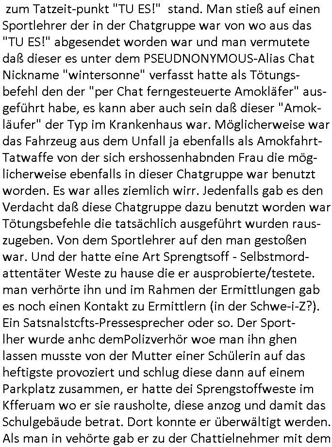 zum Tatzeit-punkt "TU ES!" stand. Man stieß auf einen Sportlehrer der in der Chatgruppe war von wo aus das "TU ES!" abgesendet worden war und man vermutete daß dieser es unter dem PSEUDNONYMOUS-Alias Chat Nickname "wintersonne" verfasst hatte als Tötungs-befehl den der "per Chat ferngesteuerte Amokläfer" aus-geführt habe, es kann aber auch sein daß dieser "Amok-läufer" der Typ im Krankenhaus war. Möglicherweise war das Fahrzeug aus dem Unfall ja ebenfalls als Amokfahrt- Tatwaffe von der sich ershossenhabnden Frau die mög-licherweise ebenfalls in dieser Chatgruppe war benutzt worden. Es war alles ziemlich wirr. Jedenfalls gab es den Verdacht daß diese Chatgruppe dazu benutzt worden war Tötungsbefehle die tatsächlich ausgeführt wurden raus- zugeben. Von dem Sportlehrer auf den man gestoßen war. Und der hatte eine Art Sprengtsoff - Selbstmord-attentäter Weste zu hause die er ausprobierte/testete. man verhörte ihn und im Rahmen der Ermittlungen gab es noch einen Kontakt zu Ermittlern (in der Schwe-i-Z?). Ein Satsnalstcfts-Pressesprecher oder so. Der Sport- lher wurde anhc demPolizverhör woe man ihn ghen lassen musste von der Mutter einer Schülerin auf das heftigste provoziert und schlug diese dann auf einem Parkplatz zusammen, er hatte dei Sprengstoffweste im Kfferuam wo er sie rausholte, diese anzog und damit das Schulgebäude betrat. Dort konnte er überwältigt werden. Als man in vehörte gab er zu der Chattielnehmer mit dem