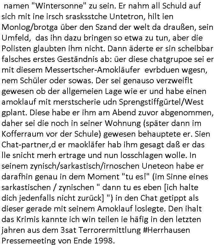 namen "Wintersonne" zu sein. Er nahm all Schuld auf sich mit ine irsch srasksstche Untetron, hilt ien Monlog/brotga über den Szand der welt da draußen, sein Umfeld, das ihn dazu bringen so etwa zu tun, aber die Polisten glaubten ihm nicht. Dann äderte er sin scheibbar falsches erstes Geständnis ab: üer diese chatgrupoe sei er mit diesem Messertscher-Amokläufer evrbduen wgesn, nem Schüler oder sowas. Der sei genauso verzweiflt gewesen ob der allgemeien Lage wie er und habe einen amoklauf mit merstscherie udn Sprengstiffgürtel/West gplant. Diese habe er ihm am Abend zuvor abgenommen, daher sei die noch in seiner Wohnung (später dann im Kofferraum vor der Schule) gewesen behauptete er. Sien Chat-partner,d er maokläfer hab ihm gesagt daß er das lle snicht merh ertrage und nun losschlagen wolle. In seinem zynisch/sarkastisch/irnoschen Uneteon habe er darafhin genau in dem Moment "tu es!" (im Sinne eines sarkastischen / zynischen " dann tu es eben [ich halte dich jedenfalls nicht zurück] ") in den Chat getippt als dieser gerade mit seinem Amoklauf loslegte. Den ihalt das Krimis kannte ich win teilen ie häfig in den letzten jahren aus dem 3sat Terrorermittlung #Herrhausen Pressemeeting von Ende 1998.