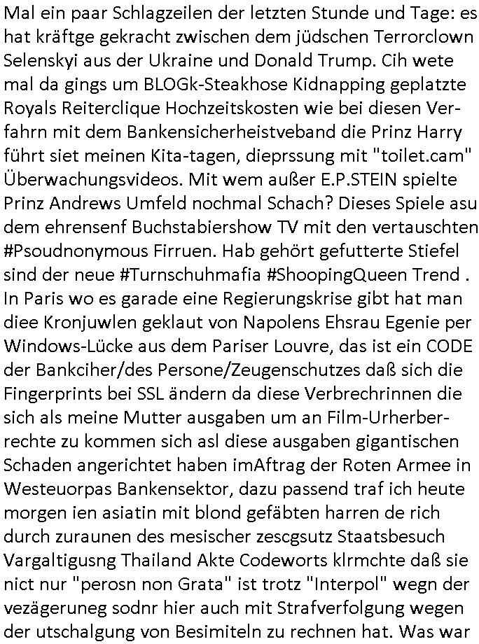Mal ein paar Schlagzeilen der letzten Stunde und Tage: es hat kräftge gekracht zwischen dem jüdschen Terrorclown Selenskyi aus der Ukraine und Donald Trump. Cih wete mal da gings um BLOGk-Steakhose Kidnapping geplatzte Royals Reiterclique Hochzeitskosten wie bei diesen Ver-fahrn mit dem Bankensicherheistveband die Prinz Harry führt siet meinen Kita-tagen, dieprssung mit "toilet.cam" Überwachungsvideos. Mit wem außer E.P.STEIN spielte Prinz Andrews Umfeld nochmal Schach? Dieses Spiele asu dem ehrensenf Buchstabiershow TV mit den vertauschten #Psoudnonymous Firruen. Hab gehört gefutterte Stiefel sind der neue #Turnschuhmafia #ShoopingQueen Trend . In Paris wo es garade eine Regierungskrise gibt hat man diee Kronjuwlen geklaut von Napolens Ehsrau Egenie per Windows-Lücke aus dem Pariser Louvre, das ist ein CODE der Bankciher/des Persone/Zeugenschutzes daß sich die Fingerprints bei SSL ändern da diese Verbrechrinnen die sich als meine Mutter ausgaben um an Film-Urherber-rechte zu kommen sich asl diese ausgaben gigantischen Schaden angerichtet haben imAftrag der Roten Armee in Westeuorpas Bankensektor, dazu passend traf ich heute morgen ien asiatin mit blond gefäbten harren de rich durch zuraunen des mesischer zescgsutz Staatsbesuch Vargaltigusng Thailand Akte Codeworts klrmchte daß sie nict nur "perosn non Grata" ist trotz "Interpol" wegn der vezägeruneg sodnr hier auch mit Strafverfolgung wegen der utschalgung von Besimiteln zu rechnen hat. Was war