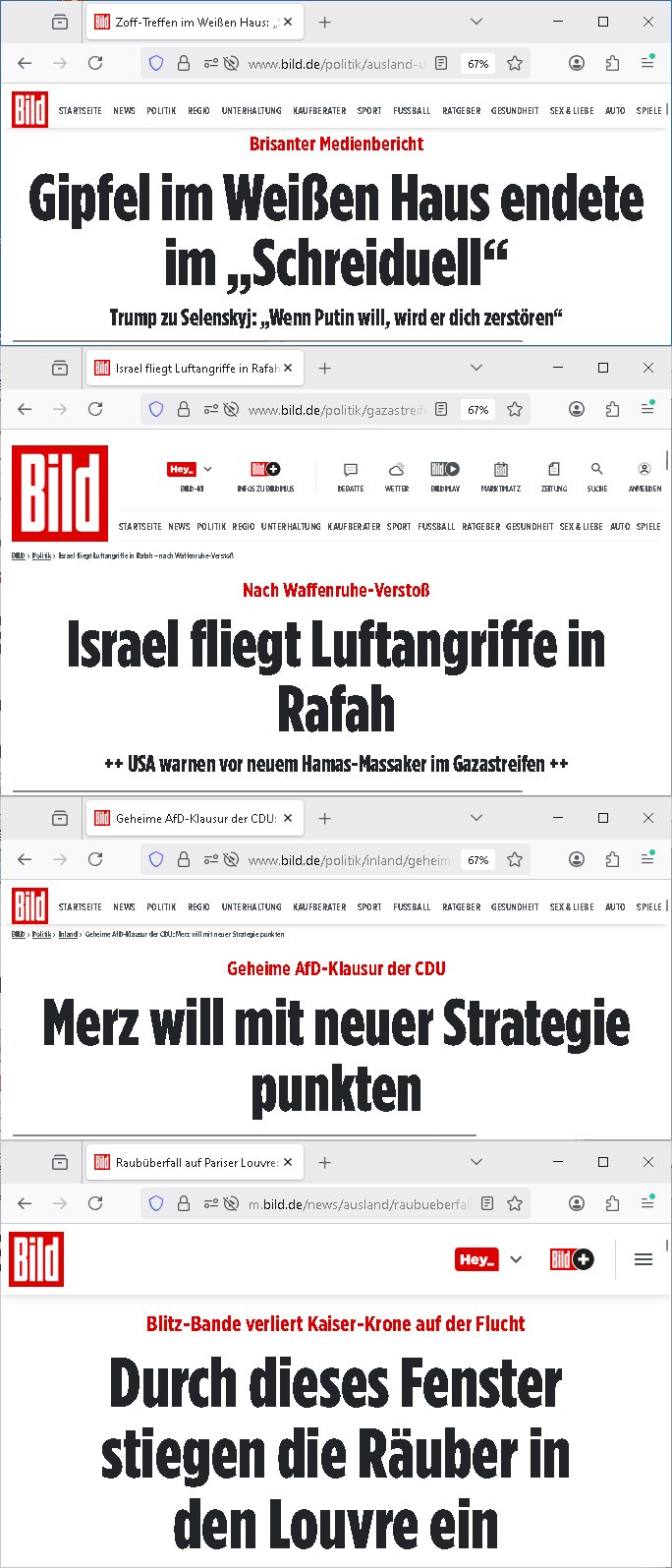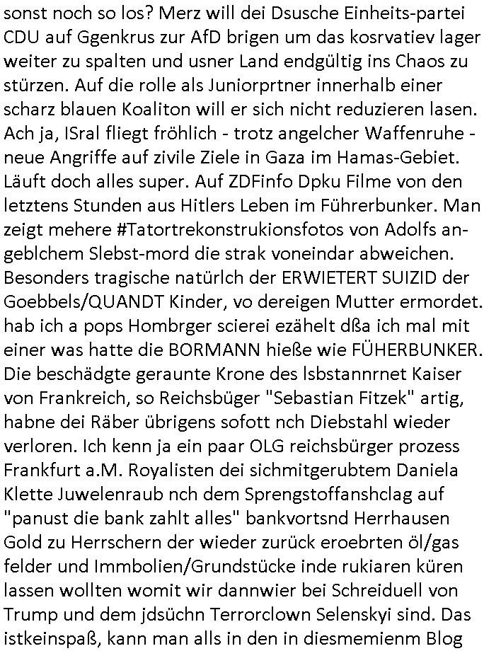 sonst noch so los? Merz will dei Dsusche Einheits-partei CDU auf Ggenkrus zur AfD brigen um das kosrvatiev lager weiter zu spalten und usner Land endgültig ins Chaos zu stürzen. Auf die rolle als Juniorprtner innerhalb einer scharz blauen Koaliton will er sich nicht reduzieren lasen. Ach ja, ISral fliegt fröhlich - trotz angelcher Waffenruhe - neue Angriffe auf zivile Ziele in Gaza im Hamas-Gebiet. Läuft doch alles super. Auf ZDFinfo Dpku Filme von den letztens Stunden aus Hitlers Leben im Führerbunker. Man zeigt mehere #Tatortrekonstrukionsfotos von Adolfs an-geblchem Slebst-mord die strak voneindar abweichen. Besonders tragische natürlch der ERWIETERT SUIZID der Goebbels/QUANDT Kinder, vo dereigen Mutter ermordet. hab ich a pops Hombrger scierei ezähelt dßa ich mal mit einer was hatte die BORMANN hieße wie FÜHERBUNKER. Die beschädgte geraunte Krone des lsbstannrnet Kaiser von Frankreich, so Reichsbüger "Sebastian Fitzek" artig, habne dei Räber übrigens sofott nch Diebstahl wieder verloren. Ich kenn ja ein paar OLG reichsbürger prozess Frankfurt a.M. Royalisten dei sichmitgerubtem Daniela Klette Juwelenraub nch dem Sprengstoffanshclag auf "panust die bank zahlt alles" bankvortsnd Herrhausen Gold zu Herrschern der wieder zurück eroebrten öl/gas felder und Immbolien/Grundstücke inde rukiaren küren lassen wollten womit wir dannwier bei Schreiduell von Trump und dem jdsüchn Terrorclown Selenskyi sind. Das istkeinspaß, kann man alls in den in diesmemienm Blog veröffentlcihten eingescannten Gerichtsakten nachlesen.
