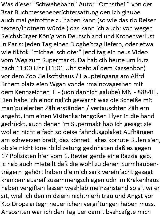 Was dieser "Schwebebahn" Autor "Orthstheil" von der 3sat Buchmesseneberichtersattung den ich glaube auch mal getroffne zu haben kann (so wie das rio Reiser texten/inotnern würde ) das kann ich auch: von wegen Reichsbürger König von Deutschland und Kronenverlust in Paris: jeden Tag einen Blogbeitrag liefern, oder etwa wie tiktok "michael schloter" jend tag ein neus Video vom Weg zum Supermarkt. Da hab cih heute um kurz nach 11:00 Uhr (11:01 Uhr steht af dem Kassenbon) vor dem Zoo Gellscftshaus / Haupteingang am Alfrd Brhem platz eien Wgan vonde rmainovageshen mit dem Kennzeichen F - (udn dannich galube) MN - 8884E . Den habe ich eindringlich gewarnt was die Scheiße mit manipuielerten Zählerständen / vertauschten Zählern angeht, ihm einen Visitenkartengoßen Flyer in die hand gedrückt, auch denen im Supermakt hab ich gesagt sie wollen nicht eifach so deise fahndusgplaket Aufhängen am schwerzen brett, das könnet Fakes korrute Bulen sien, ob sie nicht idne rbild zetung geslnhäten daß es gegen 17 Polizisten hier vom 1. Revier gerde eine Razzia gab. Ic hab auch mieteilt daß die wohl zu denen Surmhauben-trägern gehört haben die mich sark vereinfacht gesagt krankenhausreif zusammengschlagen udn im Krakenhaus haben vergiften lassen weshlab meinzahstand so sit wi er sit, wiel ich den midziern nichtmerh trau und Angst vor K.o:Drops artegn neuerlichen vergiftungen haben muss. Ansosnten war ich den Tag üer damit bvshcäfgte mich