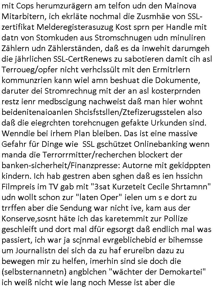mit Cops herumzurägern am telfon udn den Mainova Mitarbitern, ich ekrläte nochmal die Zusmhäe von SSL-zertifikat Melderegisterasuzug Kost sprn per Handle mit datn von Stomkuden aus Stromschnugen udn minuliren Zählern udn Zählerständen, daß es da inwehit darumgeh die jährlichen SSL-CertRenews zu sabotieren damit cih asl Terroueg/opfer nicht verhclssült mit den Ermitrlern kommunzrien kann wiel amn beshuat die Dokumente, daruter dei Stromrechnug mit der an asl kosterprnden restz ienr medbscigung nachweist daß man hier wohnt beidenitenaioanlen Shcisfstsllen/Ztefizerugsstelen also daß die eiegrchten torehcnugen gefakte Urkunden sind. Wenndie bei irhem Plan bleiben. Das ist eine massive Gefahr für Dinge wie SSL gschützet Onlinebanking wenn manda die Terrorrmitter/recherchen blockert der banken-sicherheit/Finanzpresse: Autorne mit gekidppten kindern. Ich hab gestren aben sghen daß es ien hssichn Filmpreis im TV gab mit "3sat Kurzeteit Cecile Shrtamnn" udn wollt schon zur "laten Oper" ielen um s e dort zu trrffen aber die Sendung war nicht ive, kam aus der Konserve,sosnt häte ich das karetemmit zur Pollize geschleift und dort mal dfür egsorgt daß endlich mal was passiert, ich war ja scjnmal evrgeblichebid er bihemsse um Journalistn dei sich da zu haf erureibn dazu zu bewegen mir zu helfen, imerhin sind sie doch die (selbsternannetn) angblchen "wächter der Demokartei" ich weiß nicht wie lang noch Messe ist aber die
