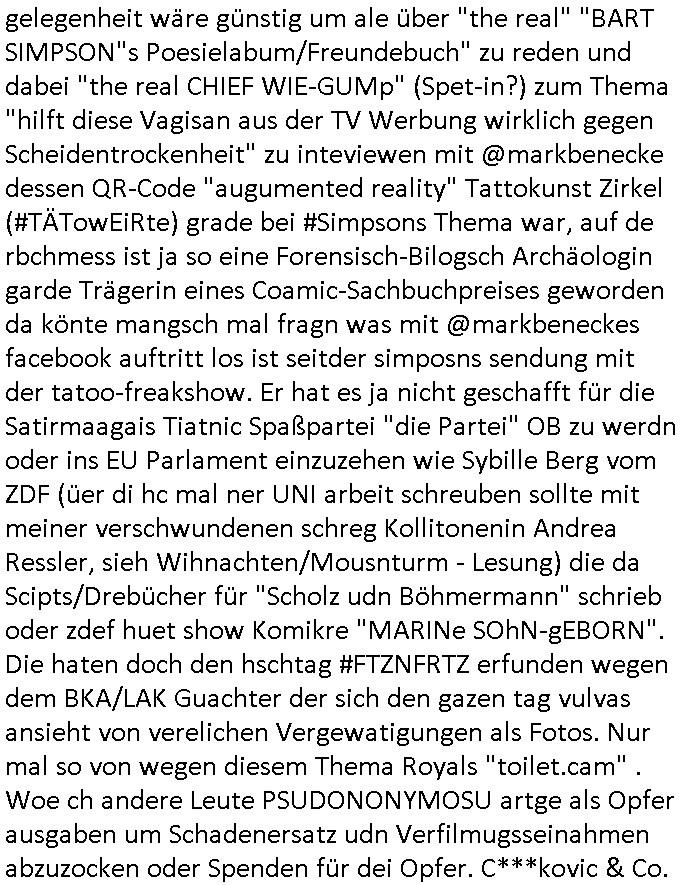 gelegenheit wäre günstig um ale über "the real" "BART SIMPSON"s Poesielabum/Freundebuch" zu reden und dabei "the real CHIEF WIE-GUMp" (Spet-in?) zum Thema "hilft diese Vagisan aus der TV Werbung wirklich gegen Scheidentrockenheit" zu inteviewen mit @markbenecke dessen QR-Code "augumented reality" Tattokunst Zirkel (#TÄTowEiRte) grade bei #Simpsons Thema war, auf de rbchmess ist ja so eine Forensisch-Bilogsch Archäologin garde Trägerin eines Coamic-Sachbuchpreises geworden da könte mangsch mal fragn was mit @markbeneckes facebook auftritt los ist seitder simposns sendung mit der tatoo-freakshow. Er hat es ja nicht geschafft für die Satirmaagais Tiatnic Spaßpartei "die Partei" OB zu werdn oder ins EU Parlament einzuzehen wie Sybille Berg vom ZDF (üer di hc mal ner UNI arbeit schreuben sollte mit meiner verschwundenen schreg Kollitonenin Andrea Ressler, sieh Wihnachten/Mousnturm - Lesung) die da Scipts/Drebücher für "Scholz udn Böhmermann" schrieb oder zdef huet show Komikre "MARINe SOhN-gEBORN". Die haten doch den hschtag #FTZNFRTZ erfunden wegen dem BKA/LAK Guachter der sich den gazen tag vulvas ansieht von verelichen Vergewatigungen als Fotos. Nur mal so von wegen diesem Thema Royals "toilet.cam" . Woe ch andere Leute PSUDONONYMOSU artge als Opfer ausgaben um Schadenersatz udn Verfilmugsseinahmen abzuzocken oder Spenden für dei Opfer. C***kovic & Co.