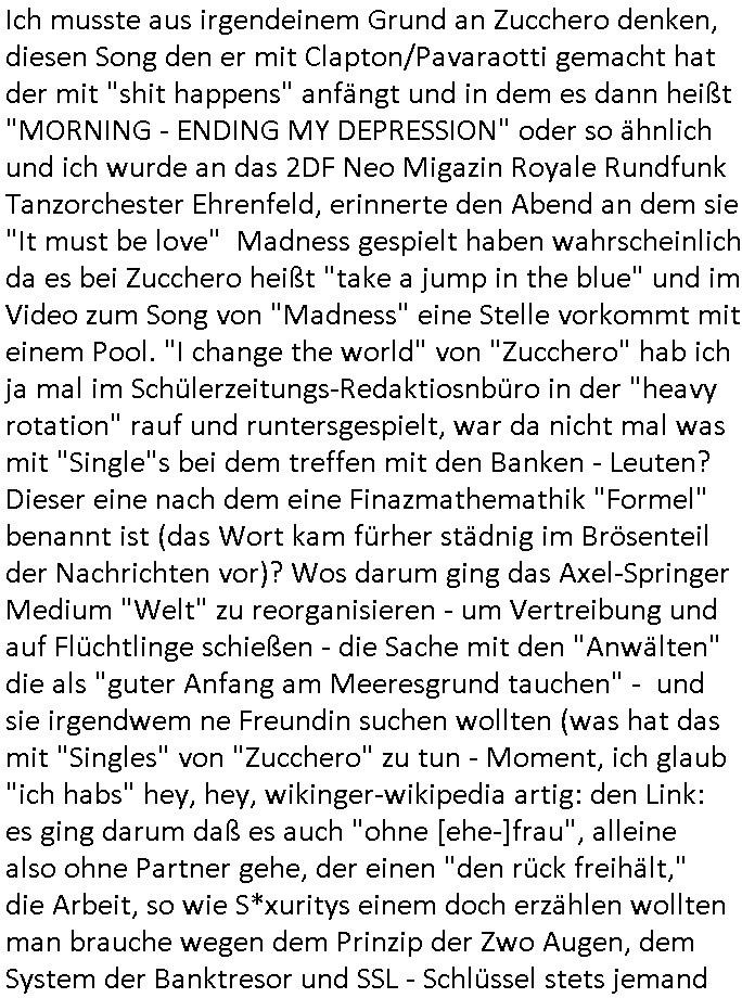 Ich musste aus irgendeinem Grund an Zucchero denken, diesen Song den er mit Clapton/Pavaraotti gemacht hat der mit "shit happens" anfängt und in dem es dann heißt "MORNING - ENDING MY DEPRESSION" oder so ähnlich und ich wurde an das 2DF Neo Migazin Royale Rundfunk Tanzorchester Ehrenfeld, erinnerte den Abend an dem sie "It must be love" Madness gespielt haben wahrscheinlich da es bei Zucchero heißt "take a jump in the blue" und im Video zum Song von "Madness" eine Stelle vorkommt mit einem Pool. "I change the world" von "Zucchero" hab ich ja mal im Schülerzeitungs-Redaktiosnbüro in der "heavy rotation" rauf und runtersgespielt, war da nicht mal was mit "Single"s bei dem treffen mit den Banken - Leuten? Dieser eine nach dem eine Finazmathemathik "Formel" benannt ist (das Wort kam fürher städnig im Brösenteil der Nachrichten vor)? Wos darum ging das Axel-Springer Medium "Welt" zu reorganisieren - um Vertreibung und auf Flüchtlinge schießen - die Sache mit den "Anwälten" die als "guter Anfang am Meeresgrund tauchen" - und sie irgendwem ne Freundin suchen wollten (was hat das mit "Singles" von "Zucchero" zu tun - Moment, ich glaub "ich habs" hey, hey, wikinger-wikipedia artig: den Link: es ging darum daß es auch "ohne [ehe-]frau", alleine also ohne Partner gehe, der einen "den rück freihält," die Arbeit, so wie S*xuritys einem doch erzählen wollten man brauche wegen dem Prinzip der Zwo Augen, dem System der Banktresor und SSL - Schlüssel stets jemand
